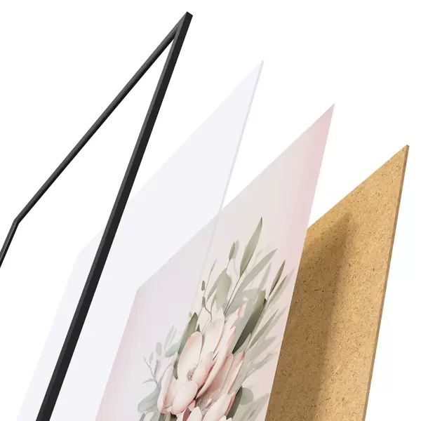 De poster bestaat uit een frame, plexiglas, geprinte afbeelding en spaanplaat achterkant. De poster kan meteen aan de muur worden gehangen dankzij de bevestigingen op de achterkant.