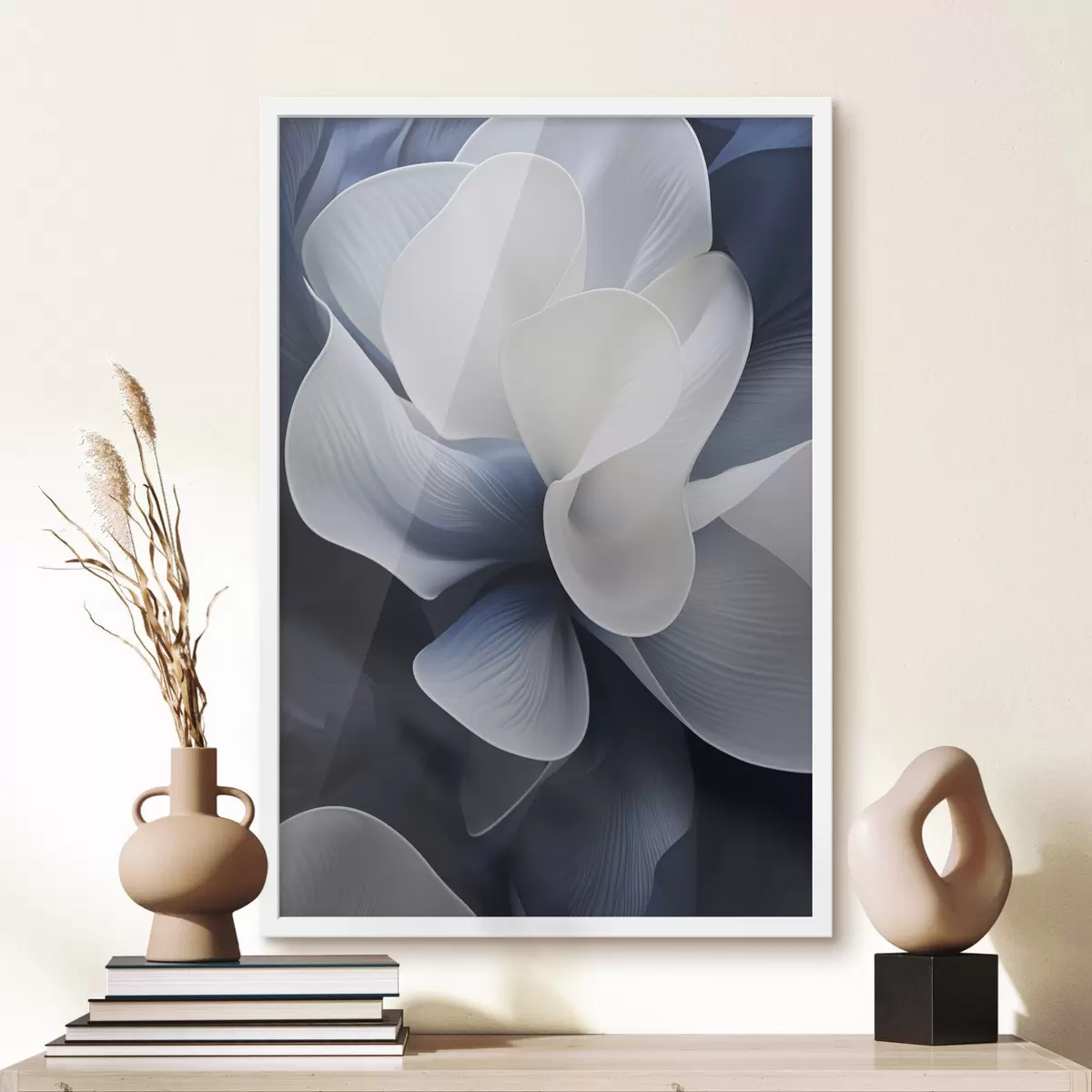 Poster Abstracte blauw-witte bloemblaadjes tegen een donkere achtergrond f48732