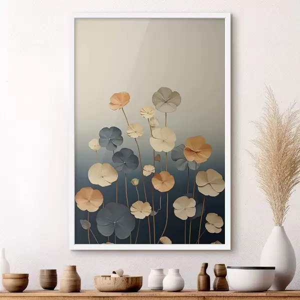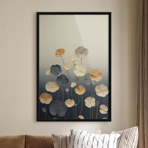 Poster Waterlelieblaadjes tegen een ingetogen achtergrond van beige en donkerblauw f48733