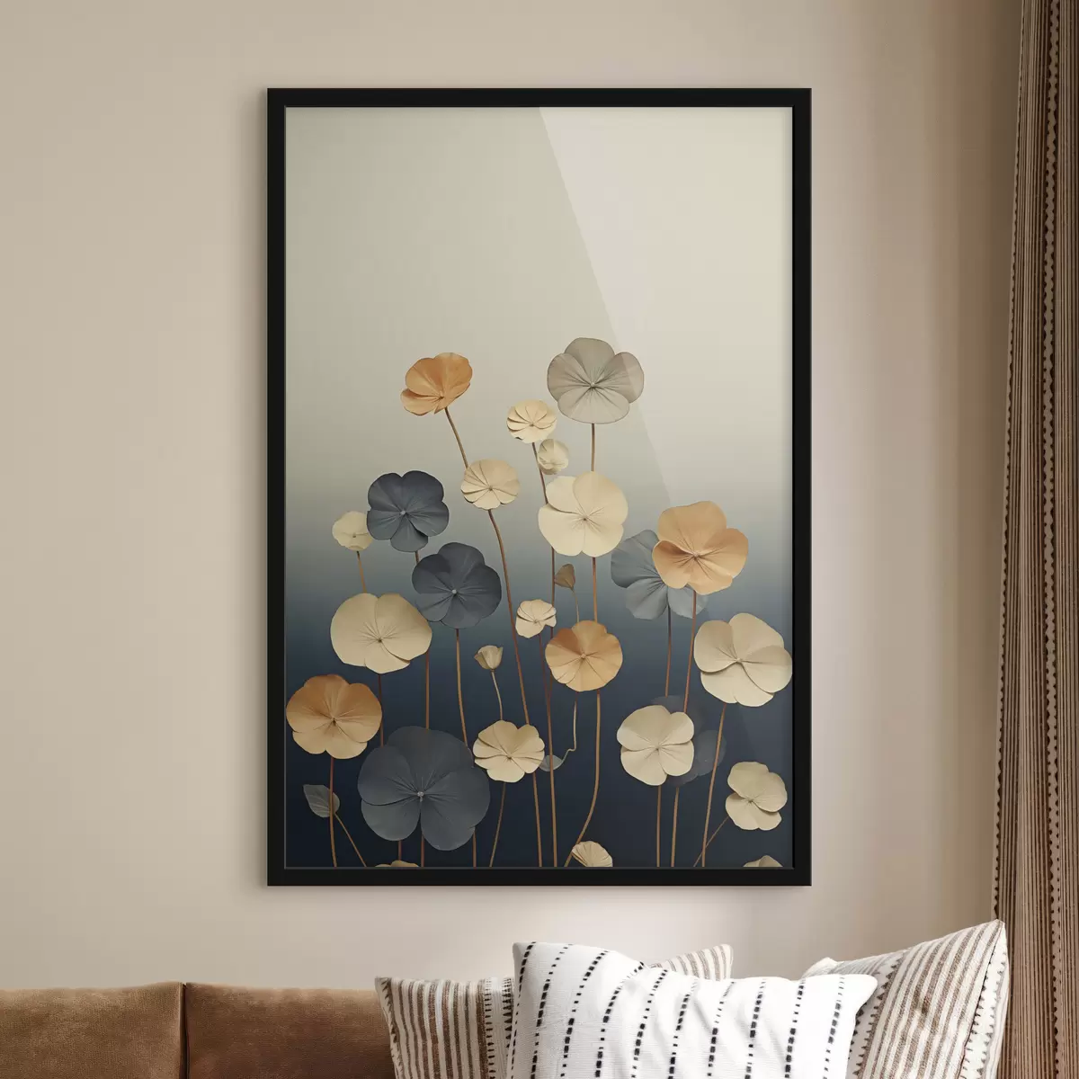Poster Waterlelieblaadjes tegen een ingetogen achtergrond van beige en donkerblauw N° f48733