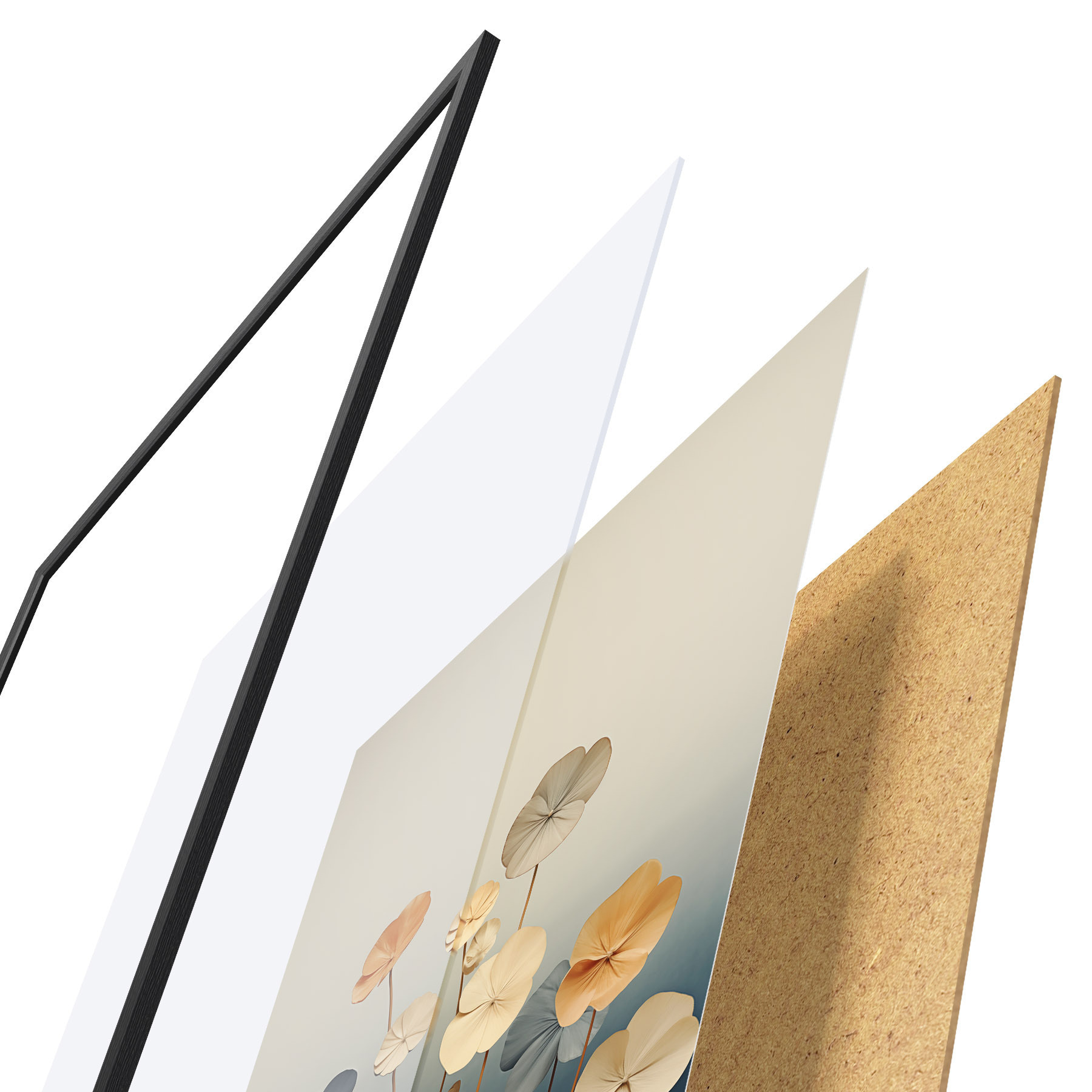 De poster bestaat uit een frame, plexiglas, geprinte afbeelding en spaanplaat achterkant. De poster kan meteen aan de muur worden gehangen dankzij de bevestigingen op de achterkant.