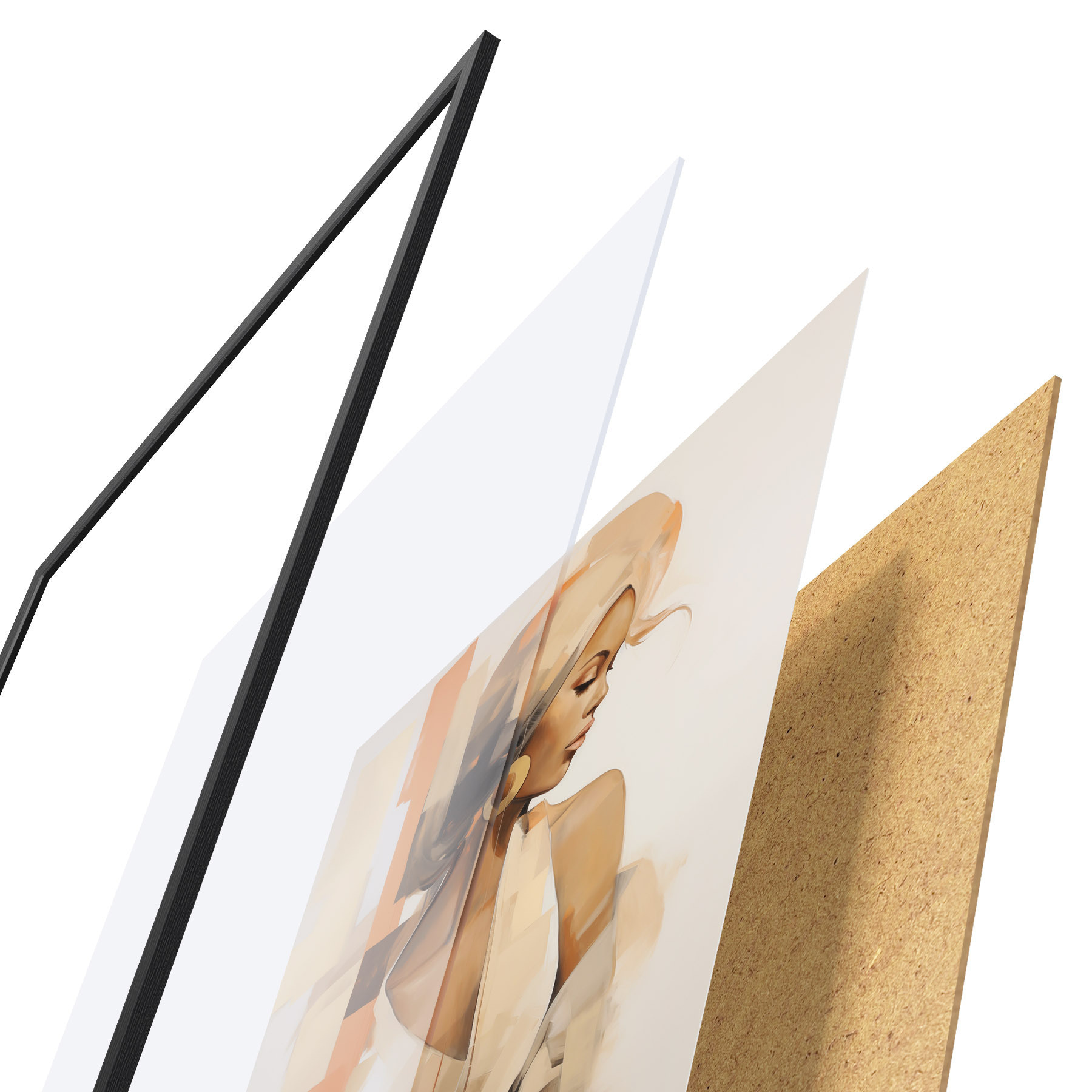 De poster bestaat uit een frame, plexiglas, geprinte afbeelding en spaanplaat achterkant. De poster kan meteen aan de muur worden gehangen dankzij de bevestigingen op de achterkant.