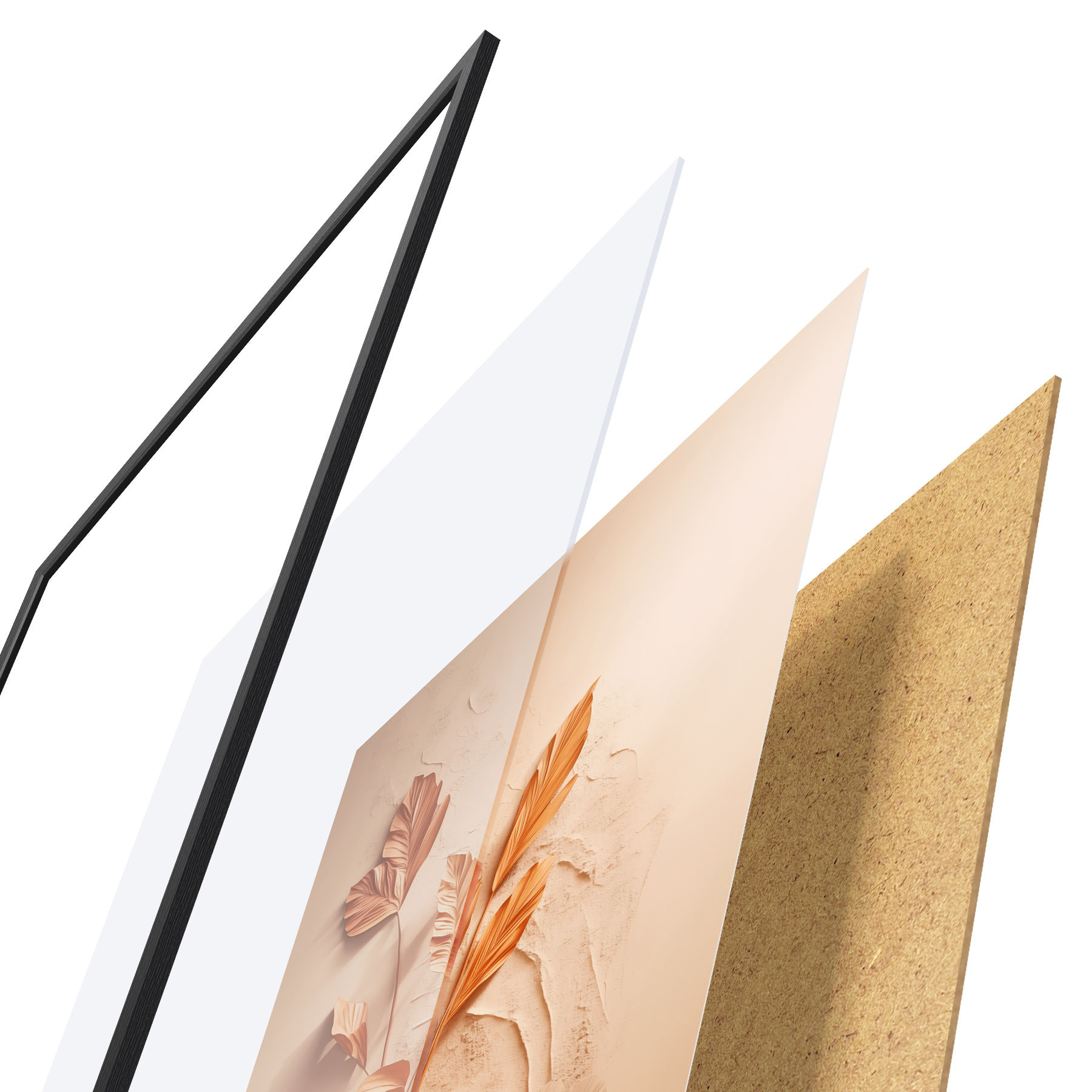 De poster bestaat uit een frame, plexiglas, geprinte afbeelding en spaanplaat achterkant. De poster kan meteen aan de muur worden gehangen dankzij de bevestigingen op de achterkant.