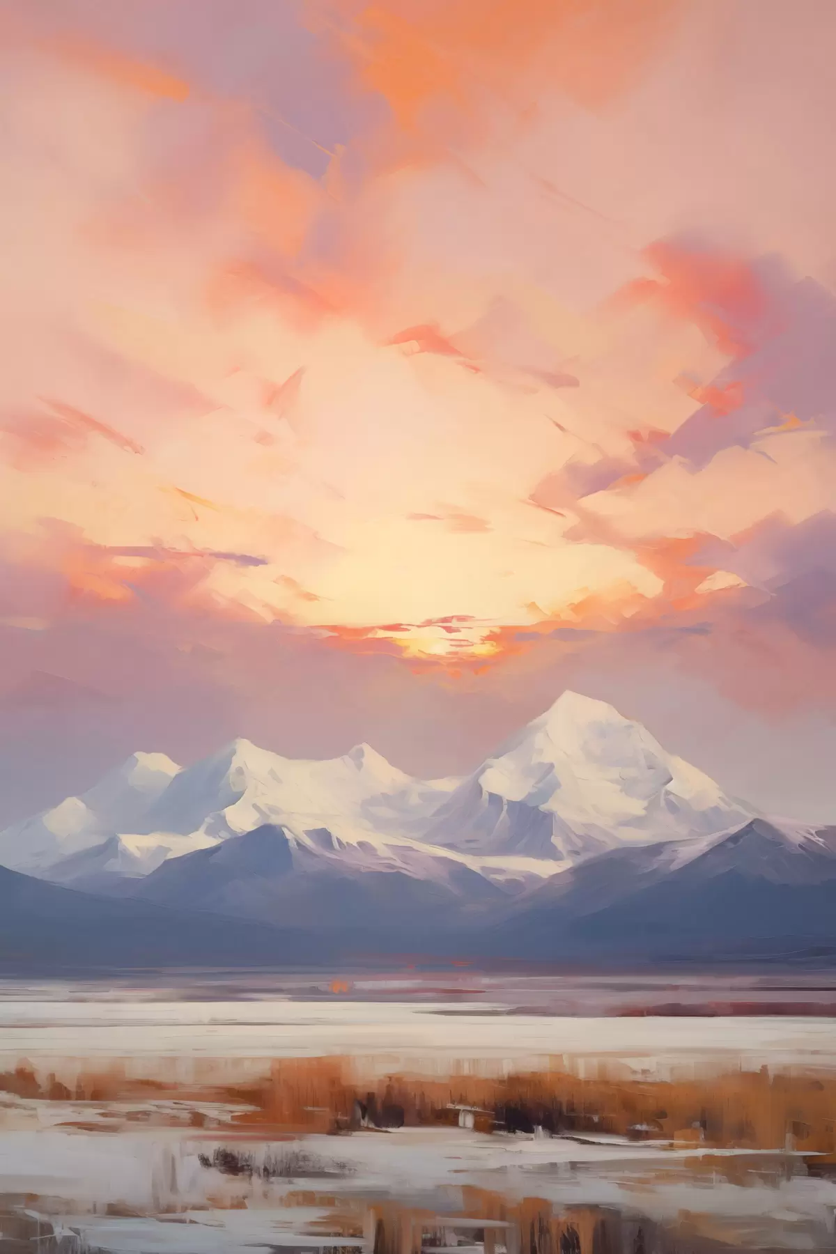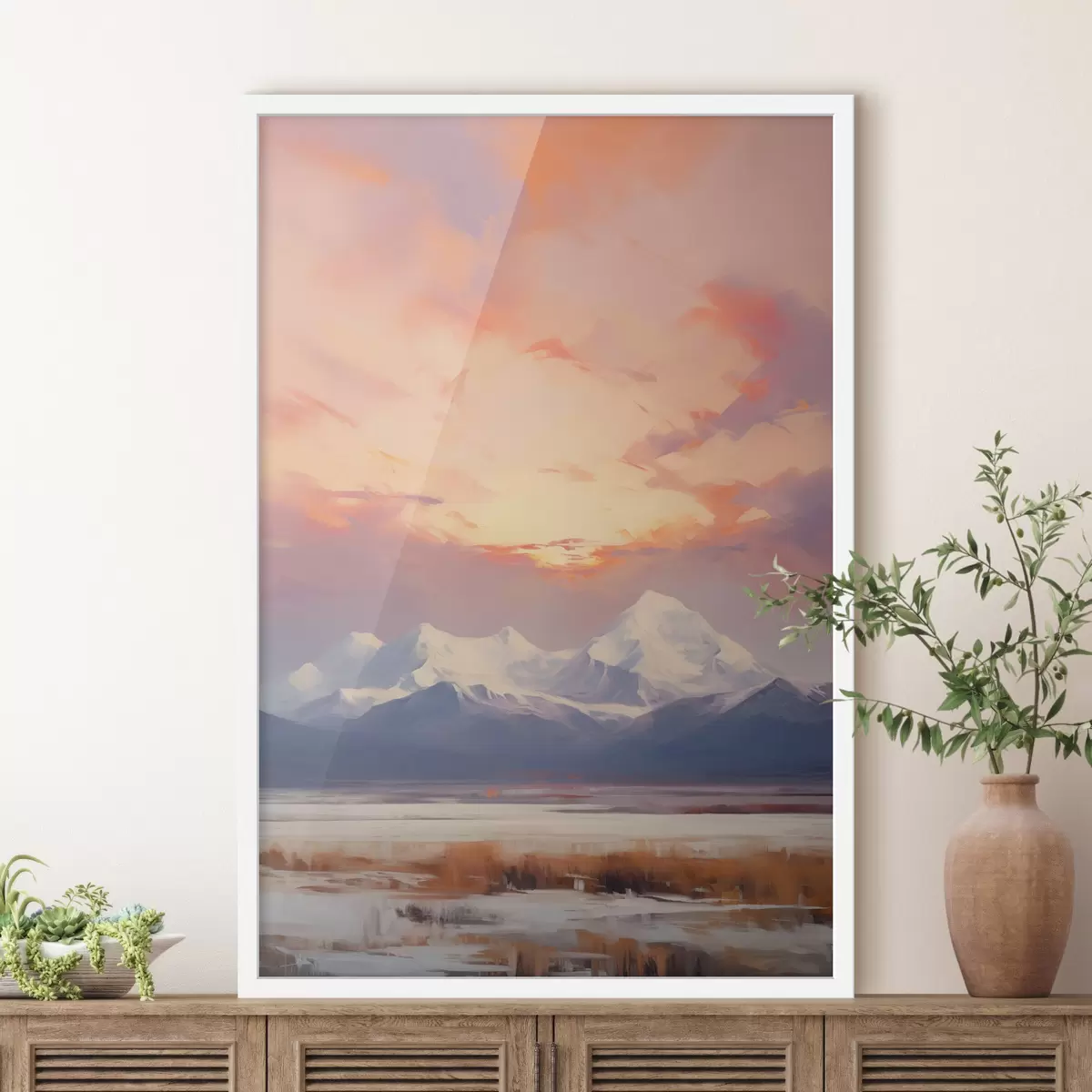 Poster Met sneeuw bedekte bergen onder een levendige oranje en roze lucht met wolken N° f48742