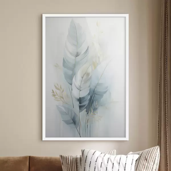 Poster Grote, zachte veren in blauw- en wittinten met delicate beige blaadjes N° f48749