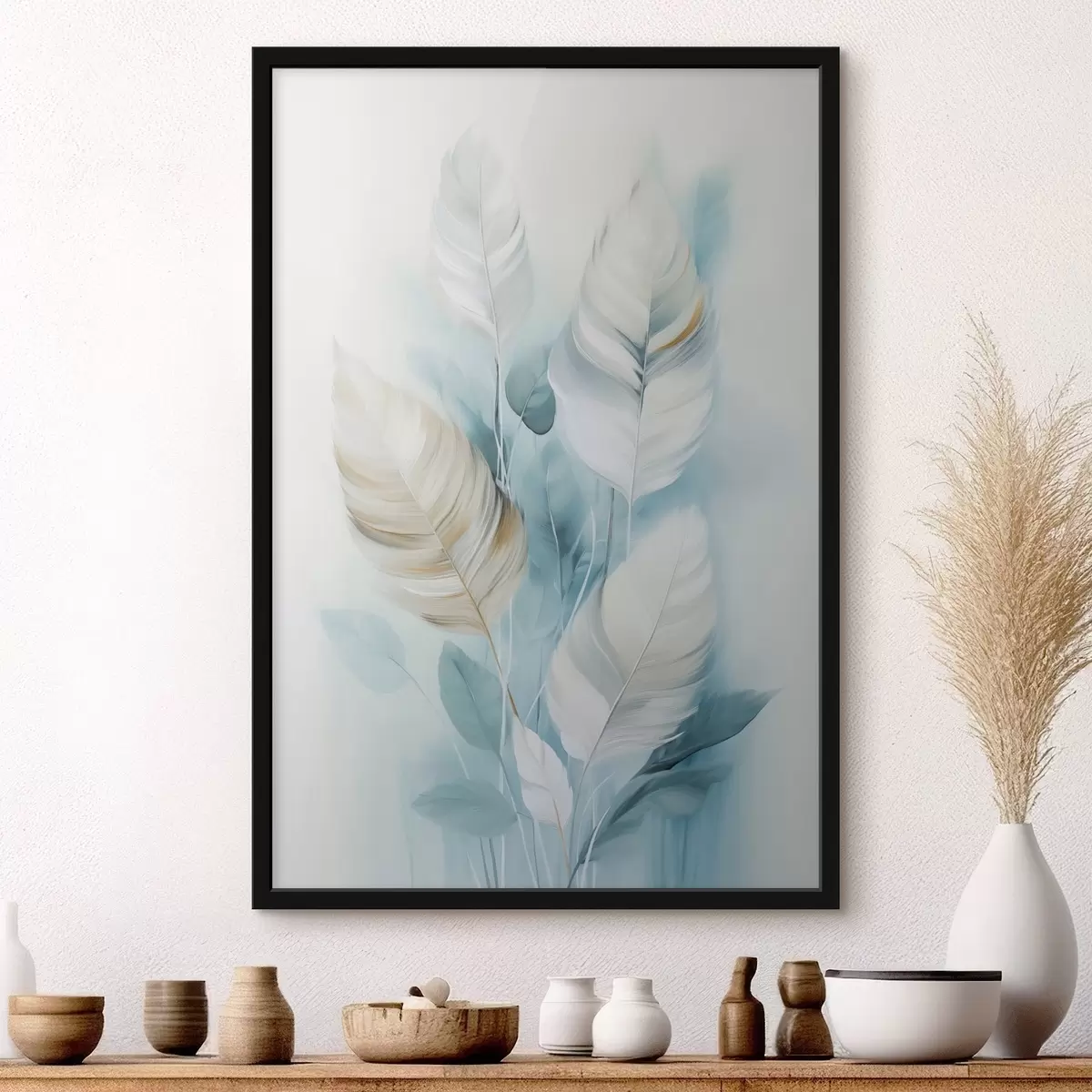 Poster Grote, zachte veren in blauw- en wittinten met delicate beige blaadjes f48750