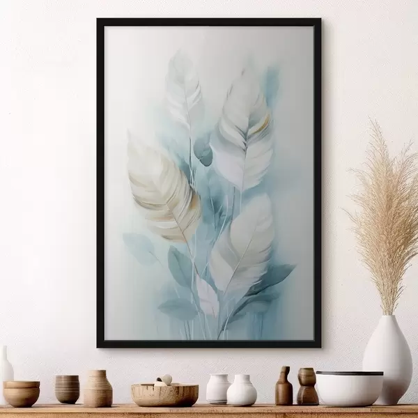 Poster Grote, zachte veren in blauw- en wittinten met delicate beige blaadjes N° f48750