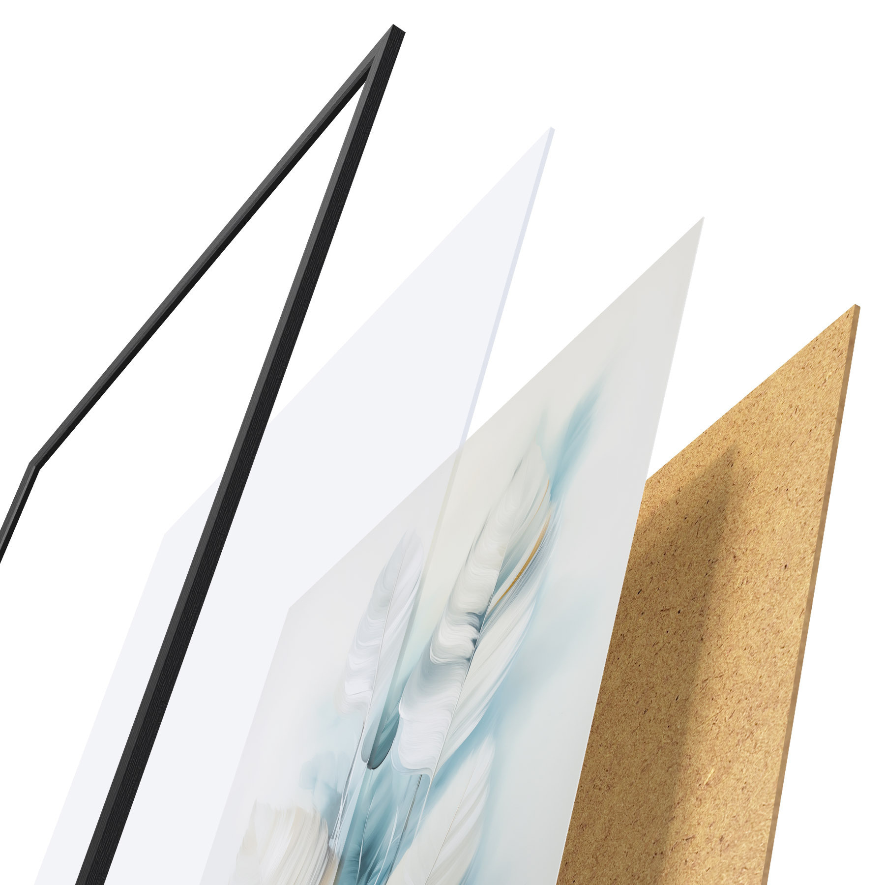 De poster bestaat uit een frame, plexiglas, geprinte afbeelding en spaanplaat achterkant. De poster kan meteen aan de muur worden gehangen dankzij de bevestigingen op de achterkant.