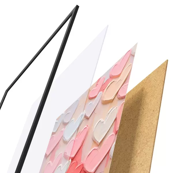 De poster bestaat uit een frame, plexiglas, geprinte afbeelding en spaanplaat achterkant. De poster kan meteen aan de muur worden gehangen dankzij de bevestigingen op de achterkant.