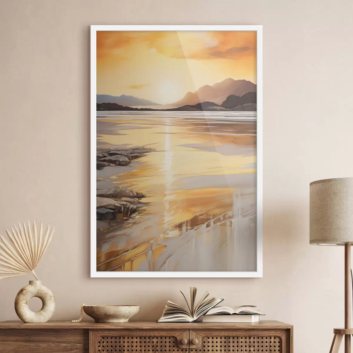 Poster Een landschap met een rivier en bergen onder een warme oranje lucht, zonsondergang f48756