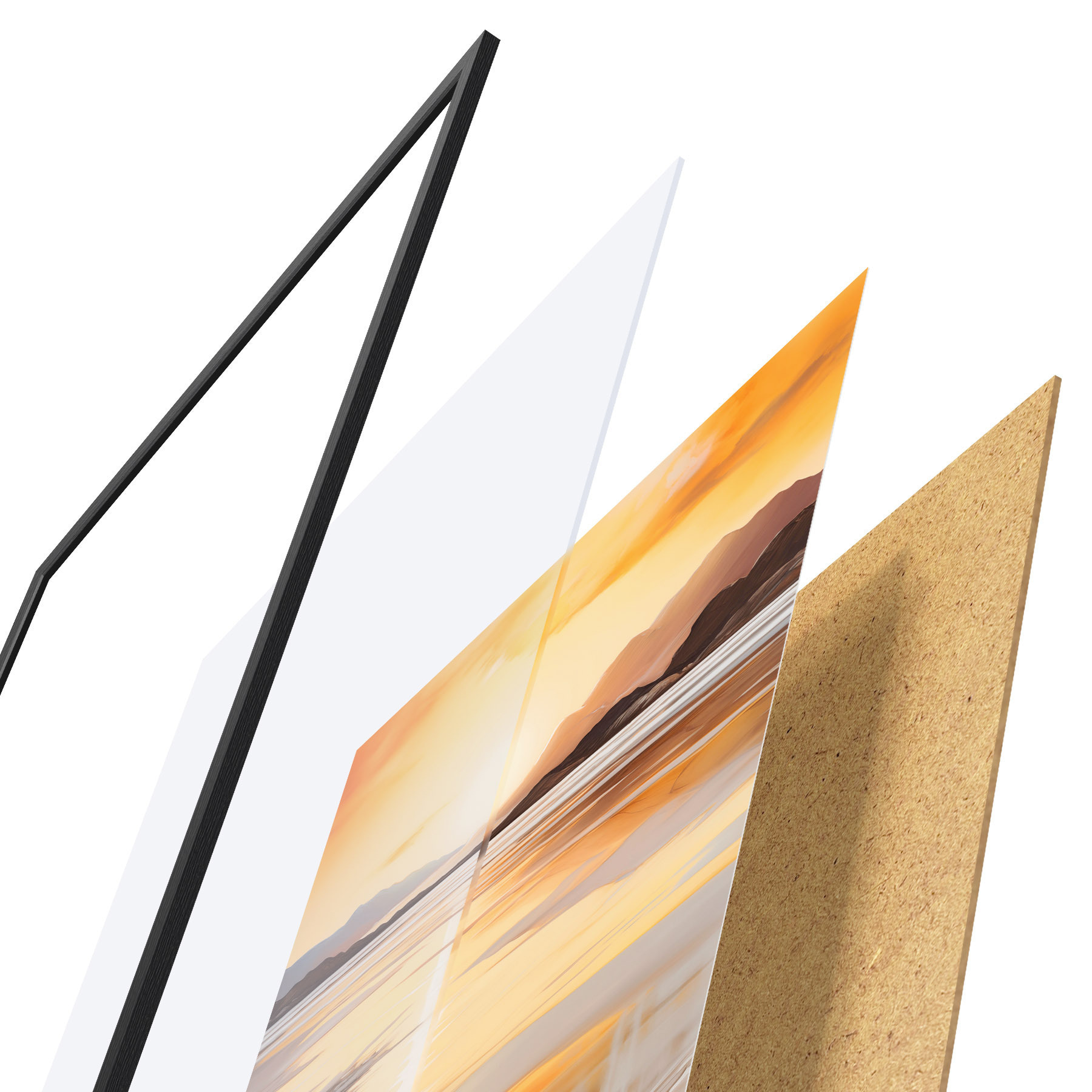 De poster bestaat uit een frame, plexiglas, geprinte afbeelding en spaanplaat achterkant. De poster kan meteen aan de muur worden gehangen dankzij de bevestigingen op de achterkant.