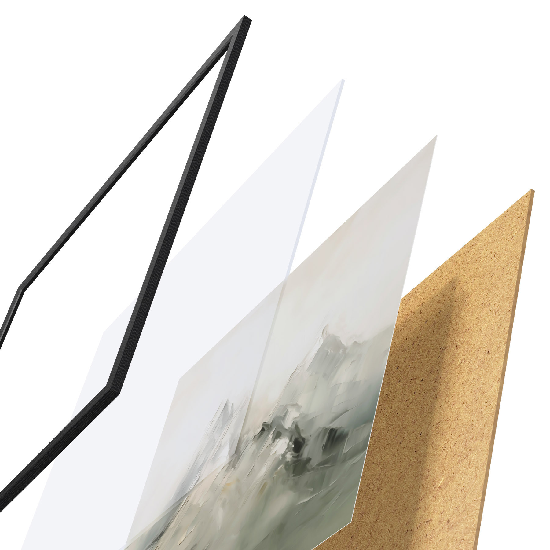 De poster bestaat uit een frame, plexiglas, geprinte afbeelding en spaanplaat achterkant. De poster kan meteen aan de muur worden gehangen dankzij de bevestigingen op de achterkant.