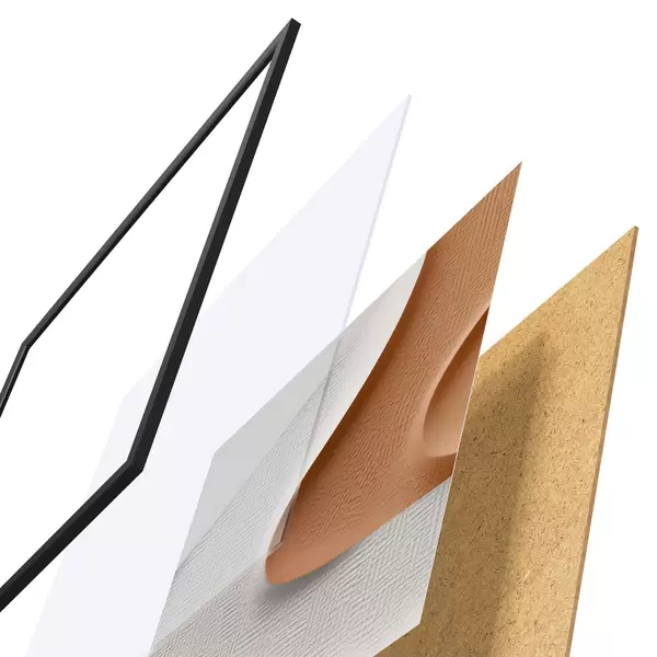 De poster bestaat uit een frame, plexiglas, geprinte afbeelding en spaanplaat achterkant. De poster kan meteen aan de muur worden gehangen dankzij de bevestigingen op de achterkant.