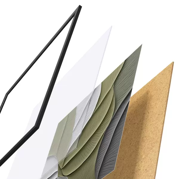 De poster bestaat uit een frame, plexiglas, geprinte afbeelding en spaanplaat achterkant. De poster kan meteen aan de muur worden gehangen dankzij de bevestigingen op de achterkant.