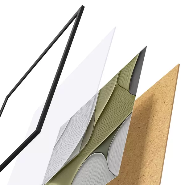 De poster bestaat uit een frame, plexiglas, geprinte afbeelding en spaanplaat achterkant. De poster kan meteen aan de muur worden gehangen dankzij de bevestigingen op de achterkant.