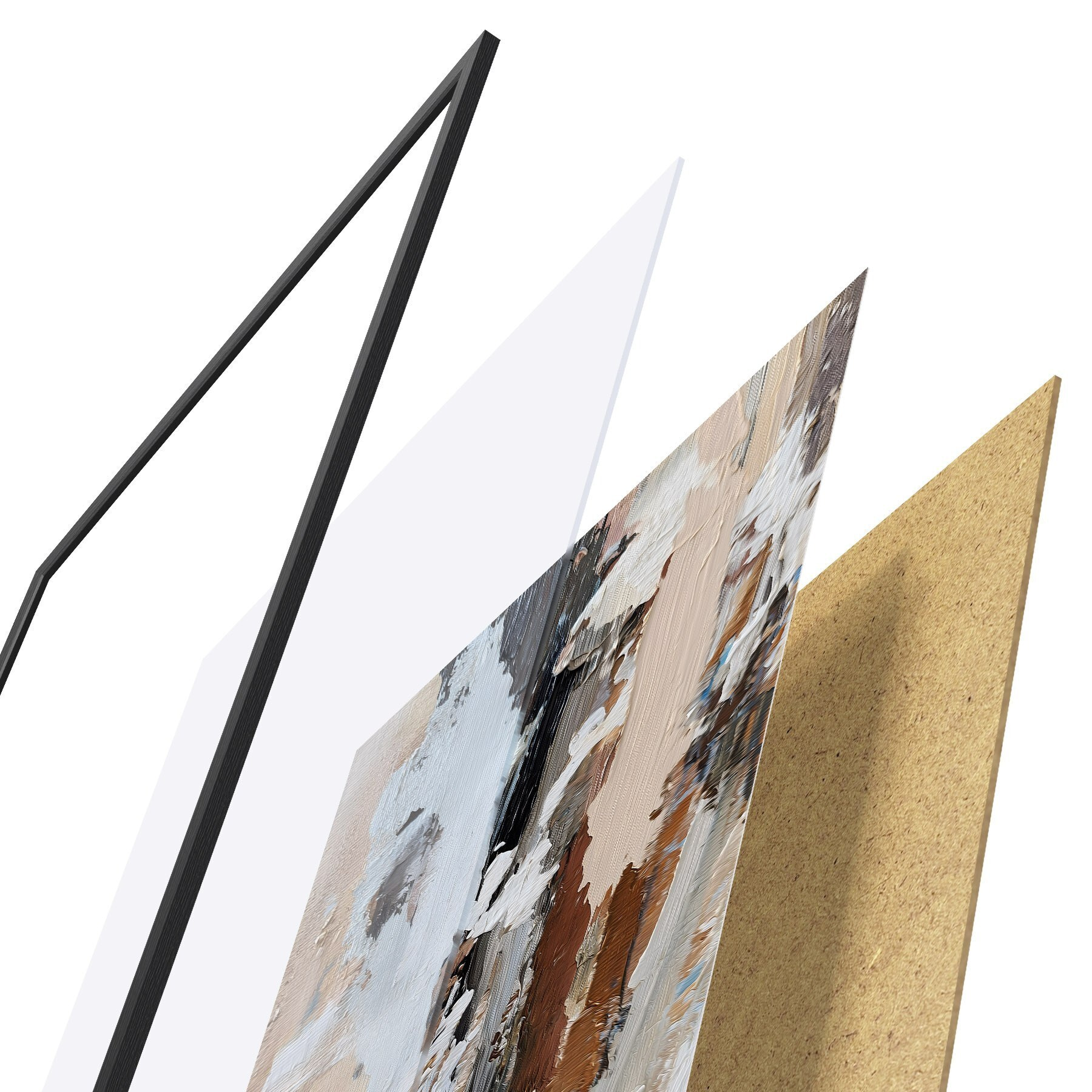 De poster bestaat uit een frame, plexiglas, geprinte afbeelding en spaanplaat achterkant. De poster kan meteen aan de muur worden gehangen dankzij de bevestigingen op de achterkant.