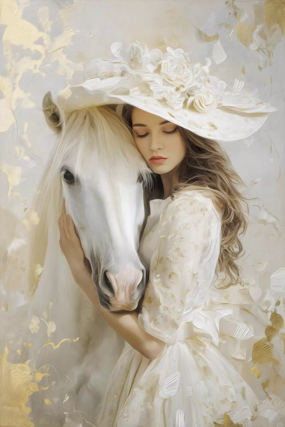 Poster een meisje met een wit paard, geschilderd in olieverfstijl N° f48790
