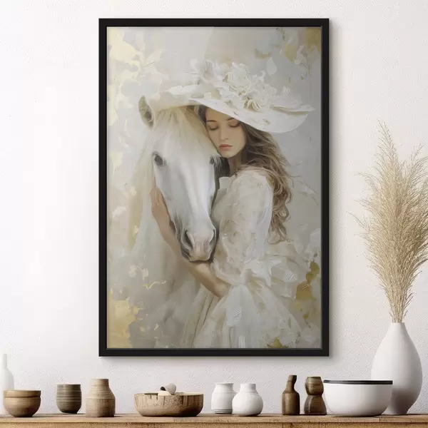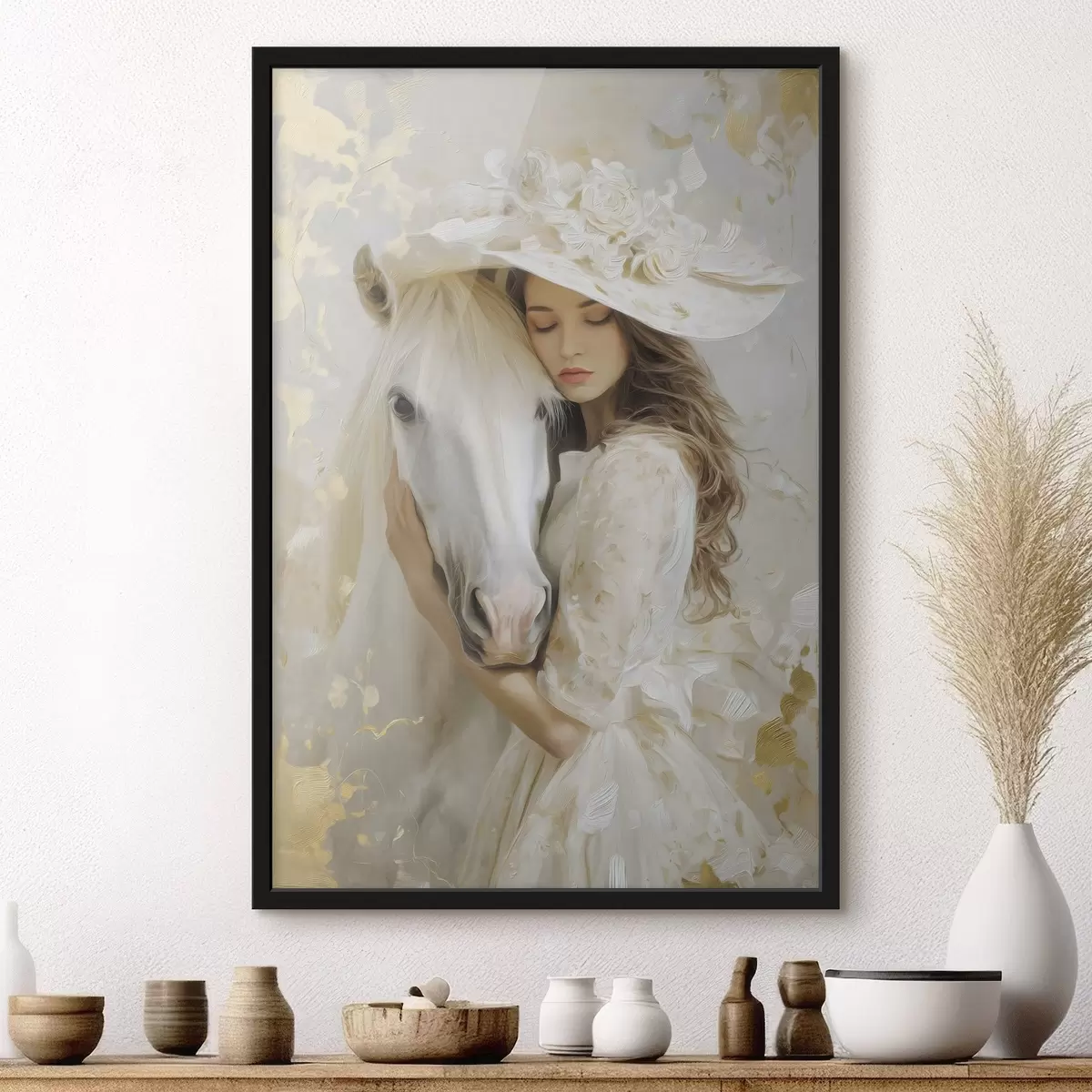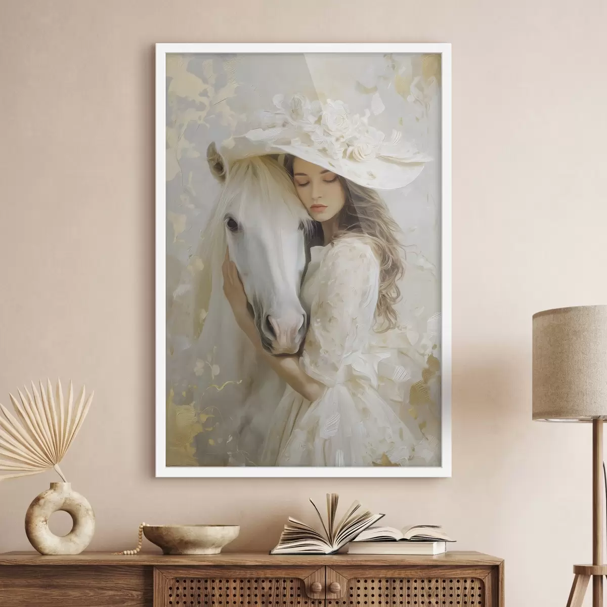 Poster een meisje met een wit paard, geschilderd in olieverfstijl f48790