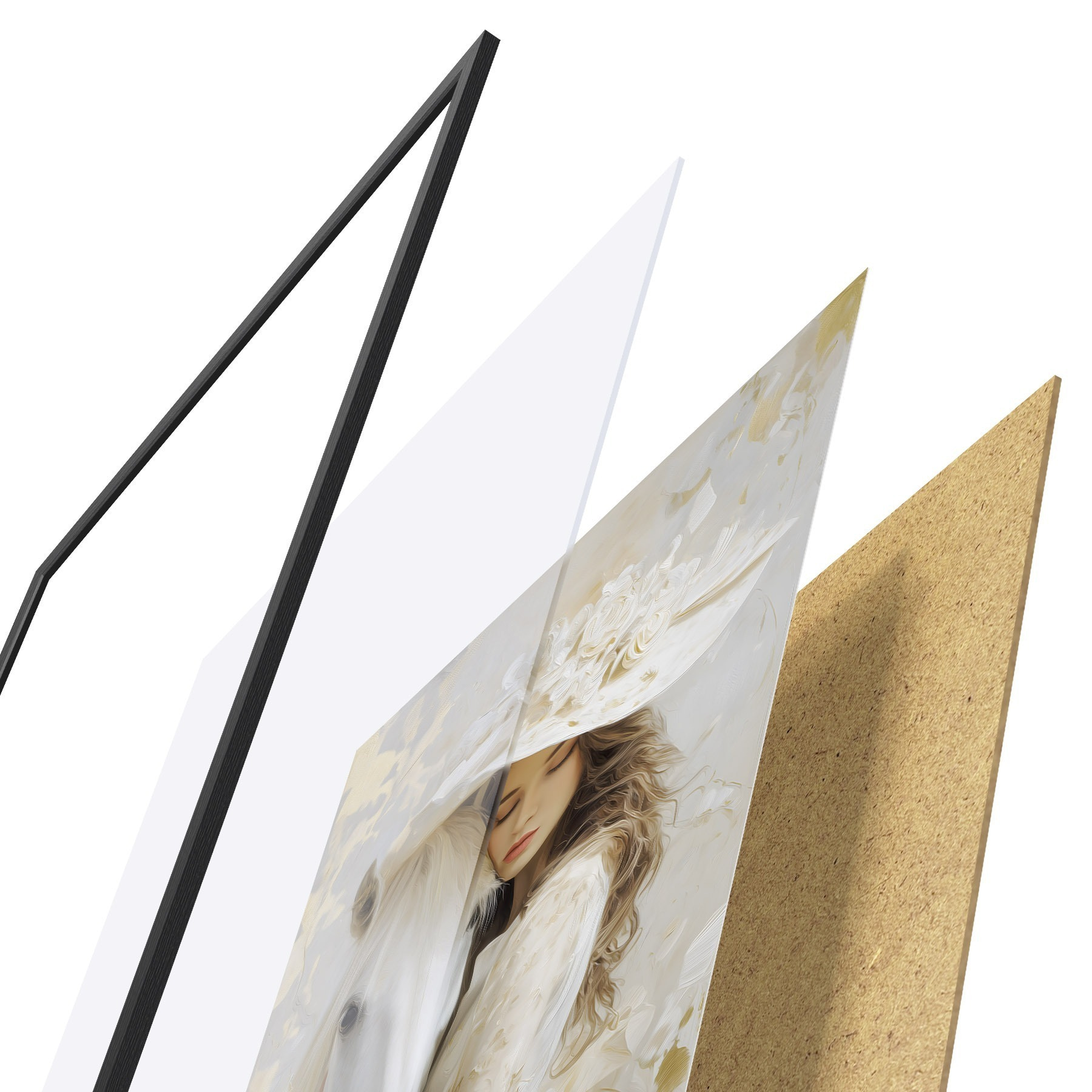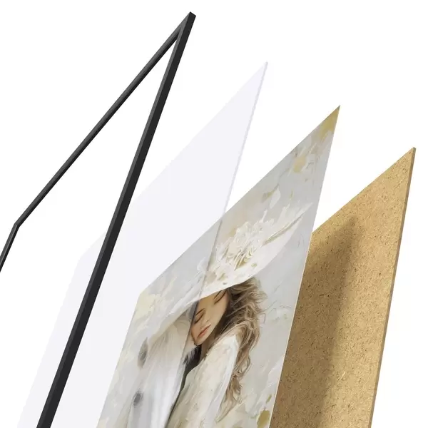 De poster bestaat uit een frame, plexiglas, geprinte afbeelding en spaanplaat achterkant. De poster kan meteen aan de muur worden gehangen dankzij de bevestigingen op de achterkant.