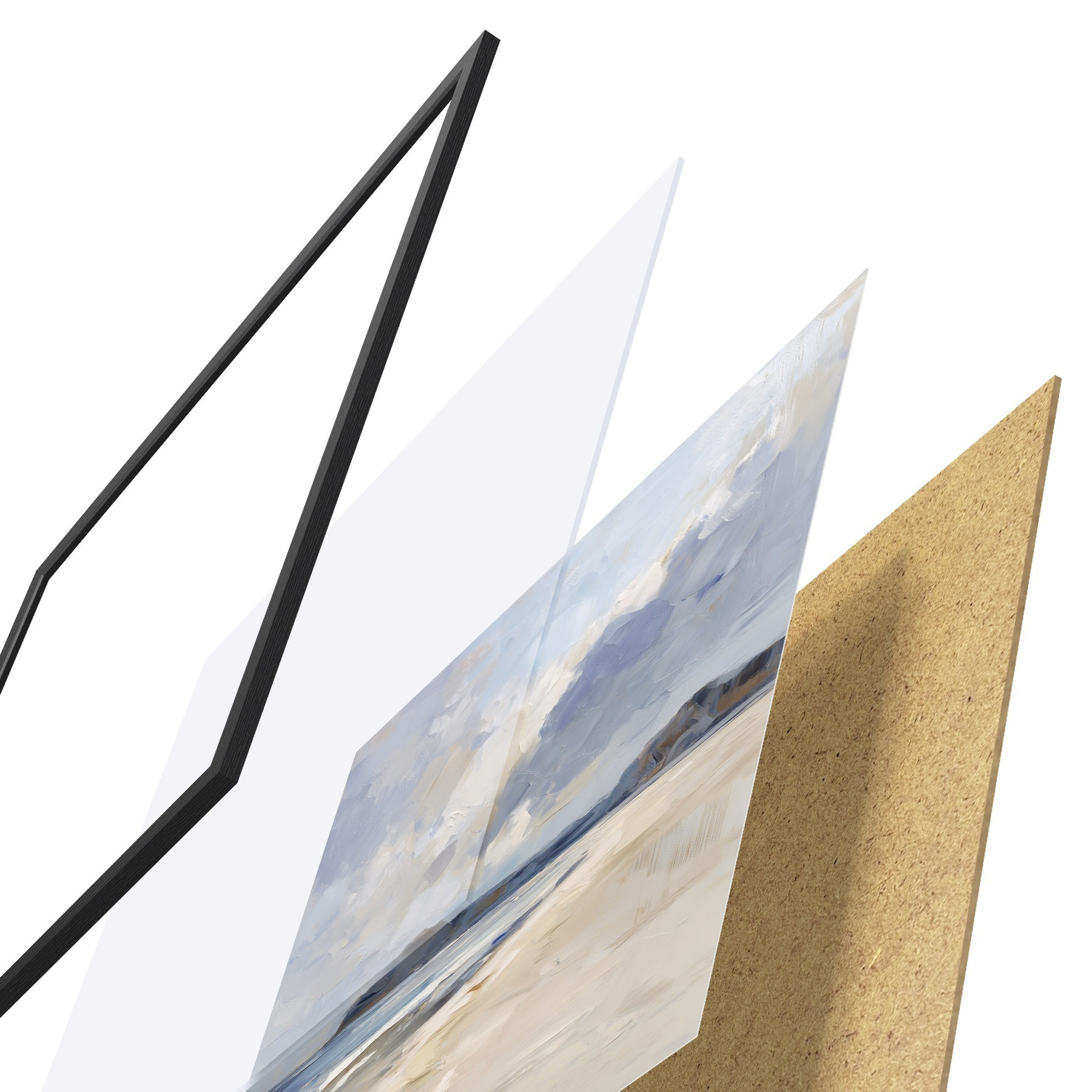 De poster bestaat uit een frame, plexiglas, geprinte afbeelding en spaanplaat achterkant. De poster kan meteen aan de muur worden gehangen dankzij de bevestigingen op de achterkant.