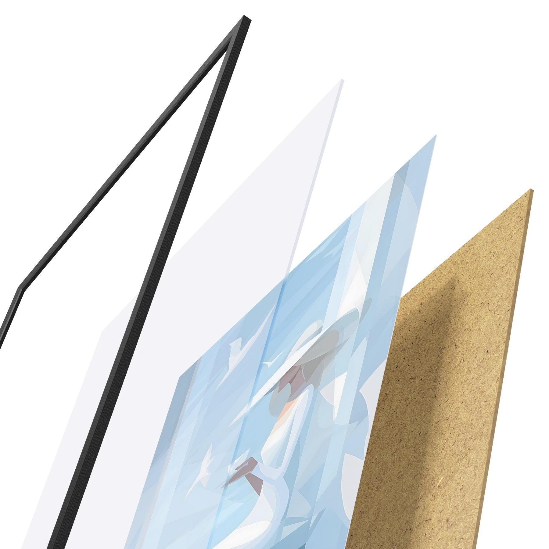 De poster bestaat uit een frame, plexiglas, geprinte afbeelding en spaanplaat achterkant. De poster kan meteen aan de muur worden gehangen dankzij de bevestigingen op de achterkant.