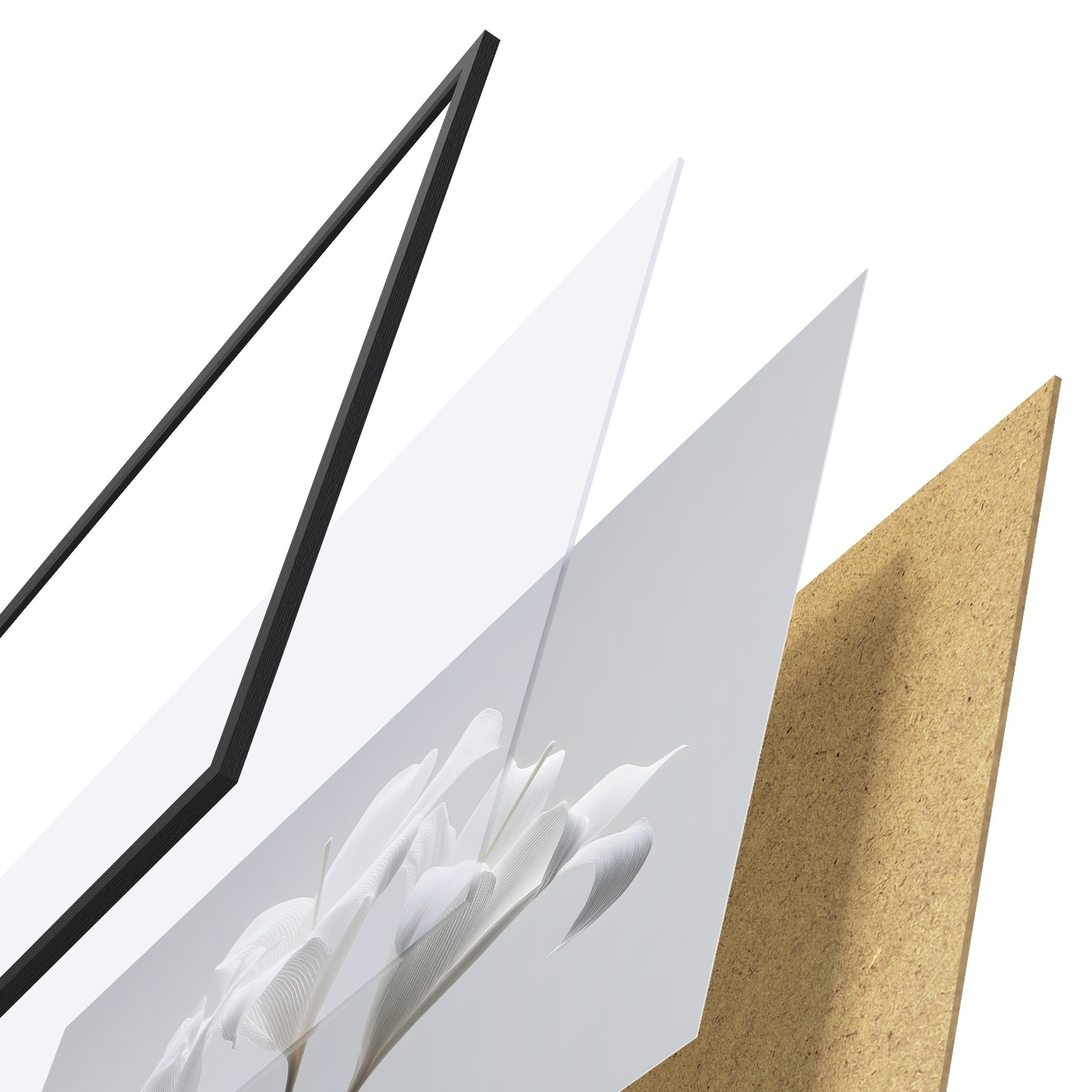 De poster bestaat uit een frame, plexiglas, geprinte afbeelding en spaanplaat achterkant. De poster kan meteen aan de muur worden gehangen dankzij de bevestigingen op de achterkant.