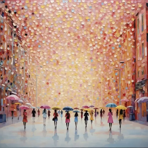 Poster Impressionistisch stadsgezicht met paraplu’s en weerspiegelingen N° f48803