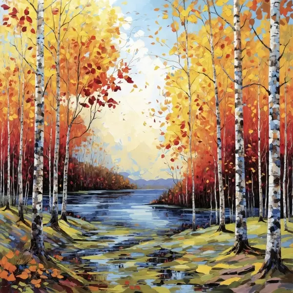 Poster Impressionistisch herfstlandschap met berkenbos en rivier N° f48809