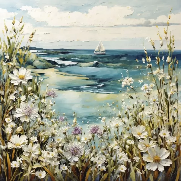 Poster Impressionistisch strandtafereel met zeilboot en bloemen N° f48813