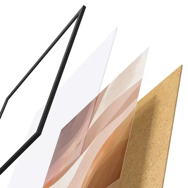 De poster bestaat uit een frame, plexiglas, geprinte afbeelding en spaanplaat achterkant. De poster kan meteen aan de muur worden gehangen dankzij de bevestigingen op de achterkant.