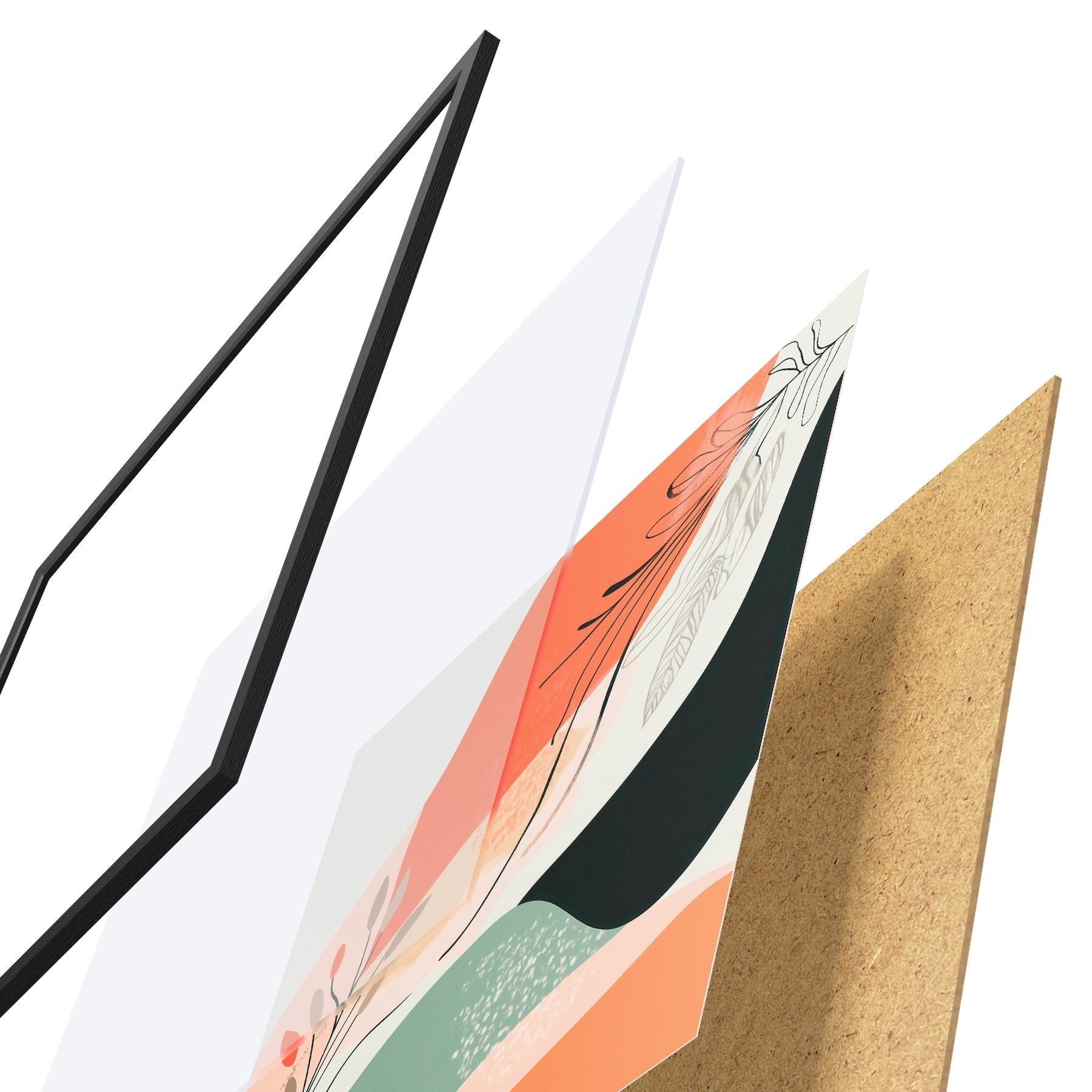 De poster bestaat uit een frame, plexiglas, geprinte afbeelding en spaanplaat achterkant. De poster kan meteen aan de muur worden gehangen dankzij de bevestigingen op de achterkant.