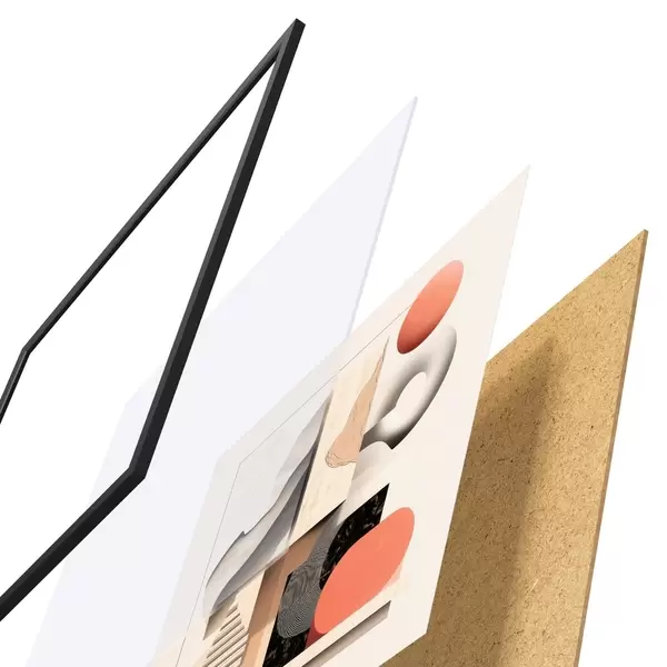 De poster bestaat uit een frame, plexiglas, geprinte afbeelding en spaanplaat achterkant. De poster kan meteen aan de muur worden gehangen dankzij de bevestigingen op de achterkant.