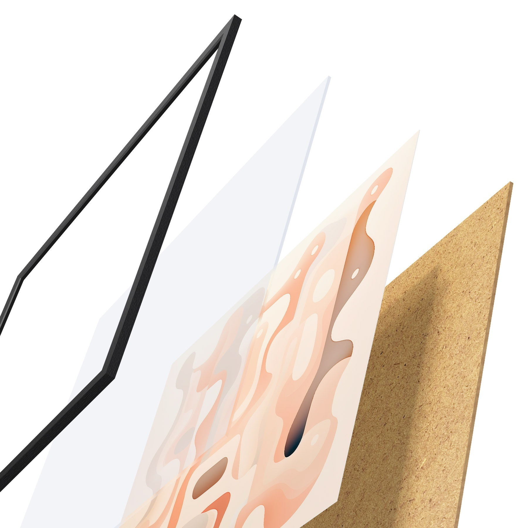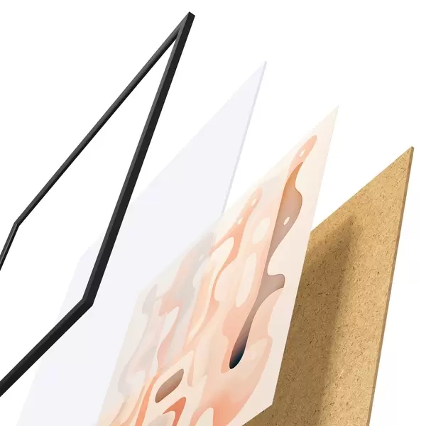 De poster bestaat uit een frame, plexiglas, geprinte afbeelding en spaanplaat achterkant. De poster kan meteen aan de muur worden gehangen dankzij de bevestigingen op de achterkant.