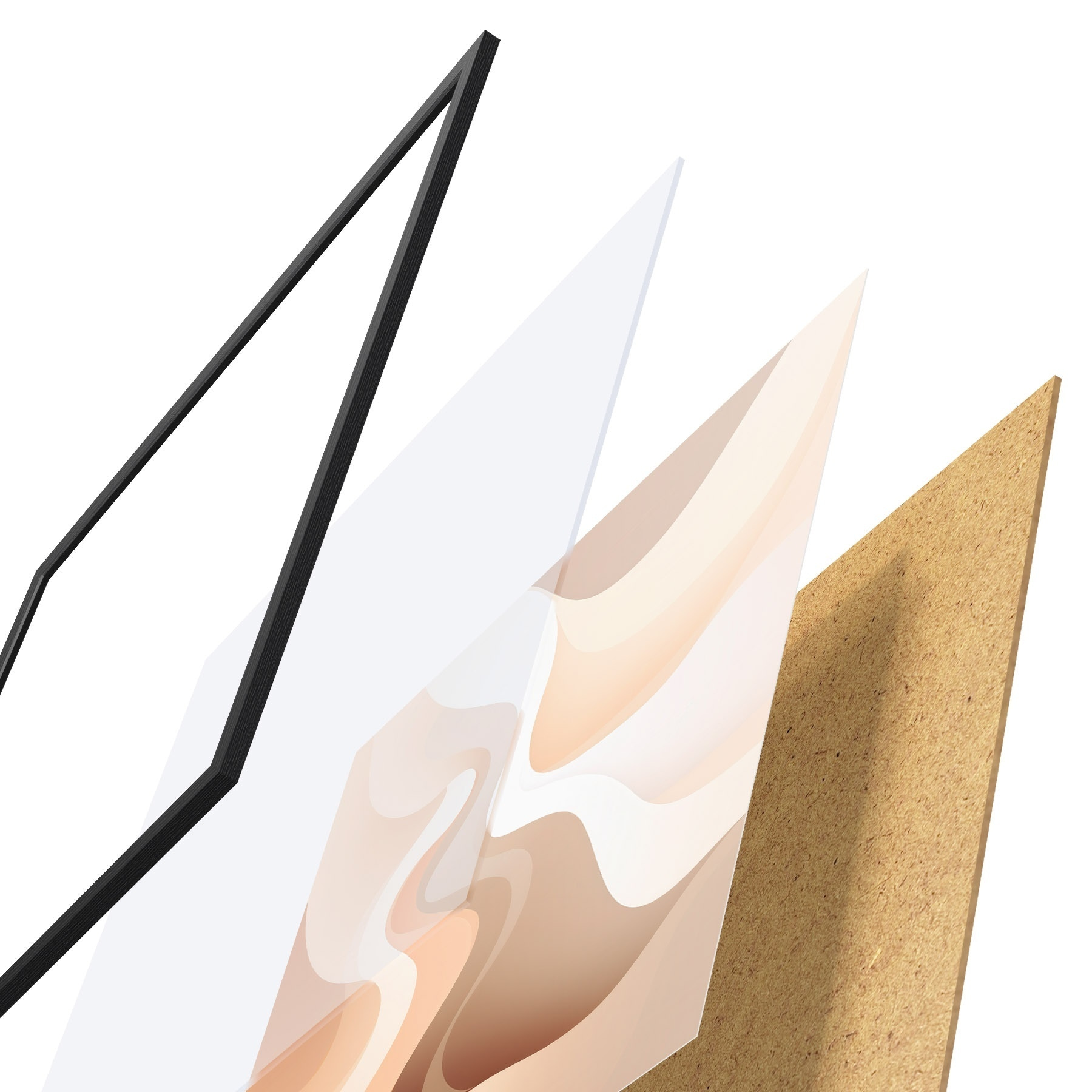 De poster bestaat uit een frame, plexiglas, geprinte afbeelding en spaanplaat achterkant. De poster kan meteen aan de muur worden gehangen dankzij de bevestigingen op de achterkant.