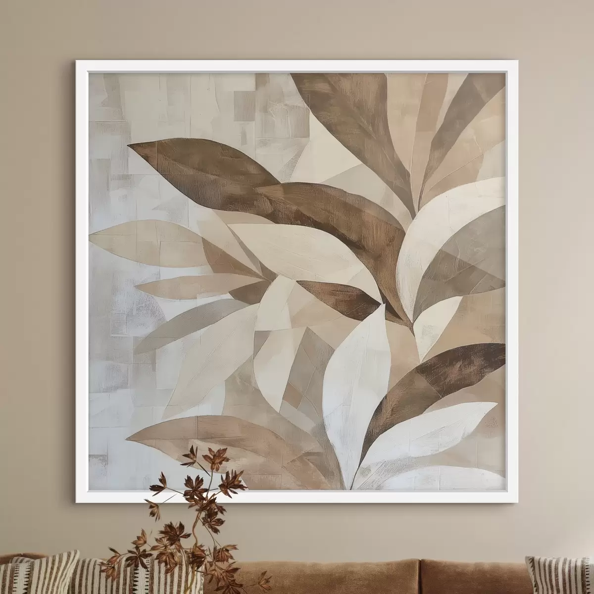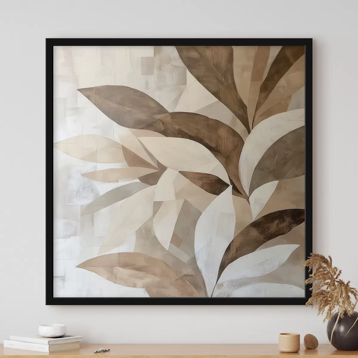 Poster Abstracte bloemcompositie met grote bladeren in bruin-beige tinten f48848