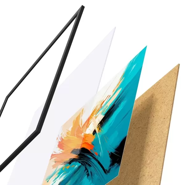 De poster bestaat uit een frame, plexiglas, geprinte afbeelding en spaanplaat achterkant. De poster kan meteen aan de muur worden gehangen dankzij de bevestigingen op de achterkant.