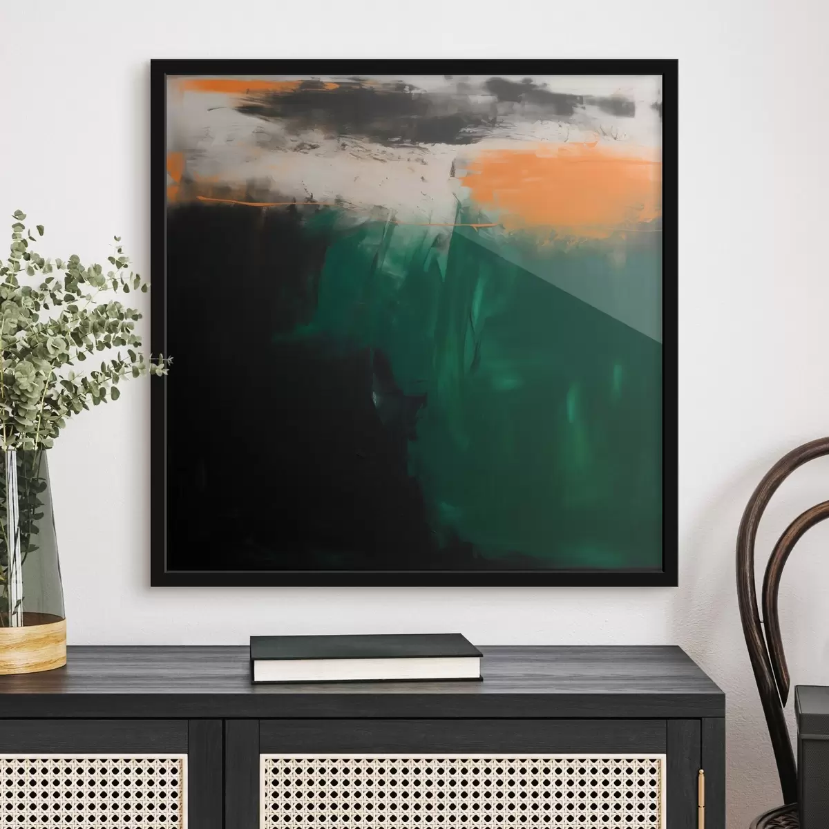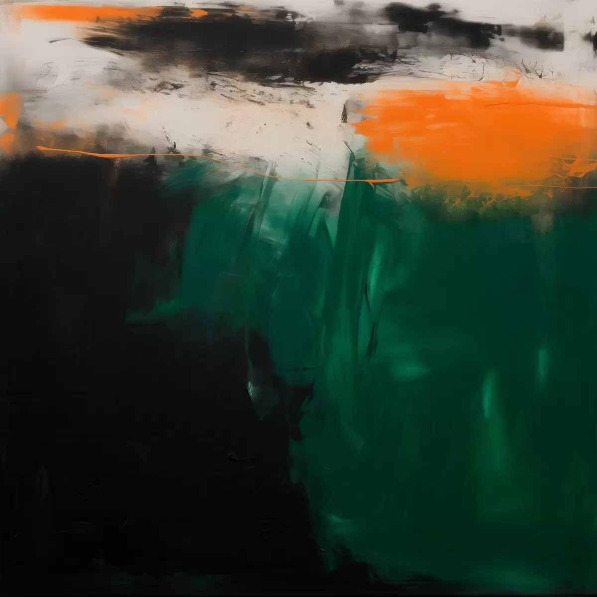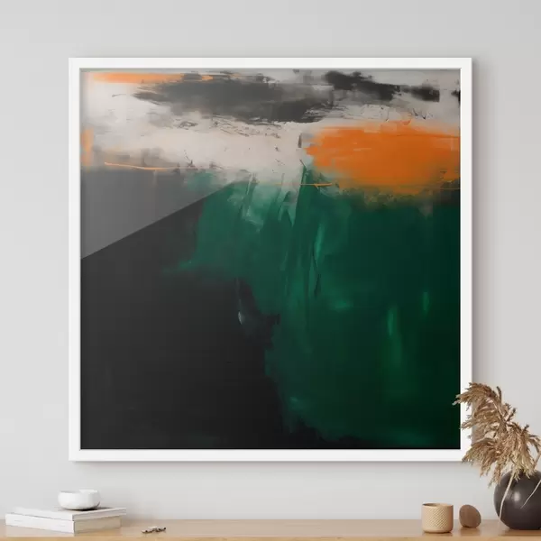 Poster Een abstract schilderij met oranje accenten en diepgroene penseelstreken in een eigentijdse stijl N° f48865