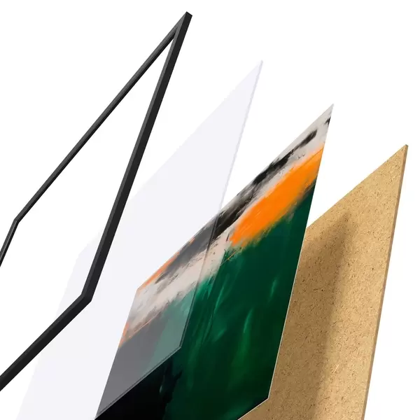 De poster bestaat uit een frame, plexiglas, geprinte afbeelding en spaanplaat achterkant. De poster kan meteen aan de muur worden gehangen dankzij de bevestigingen op de achterkant.