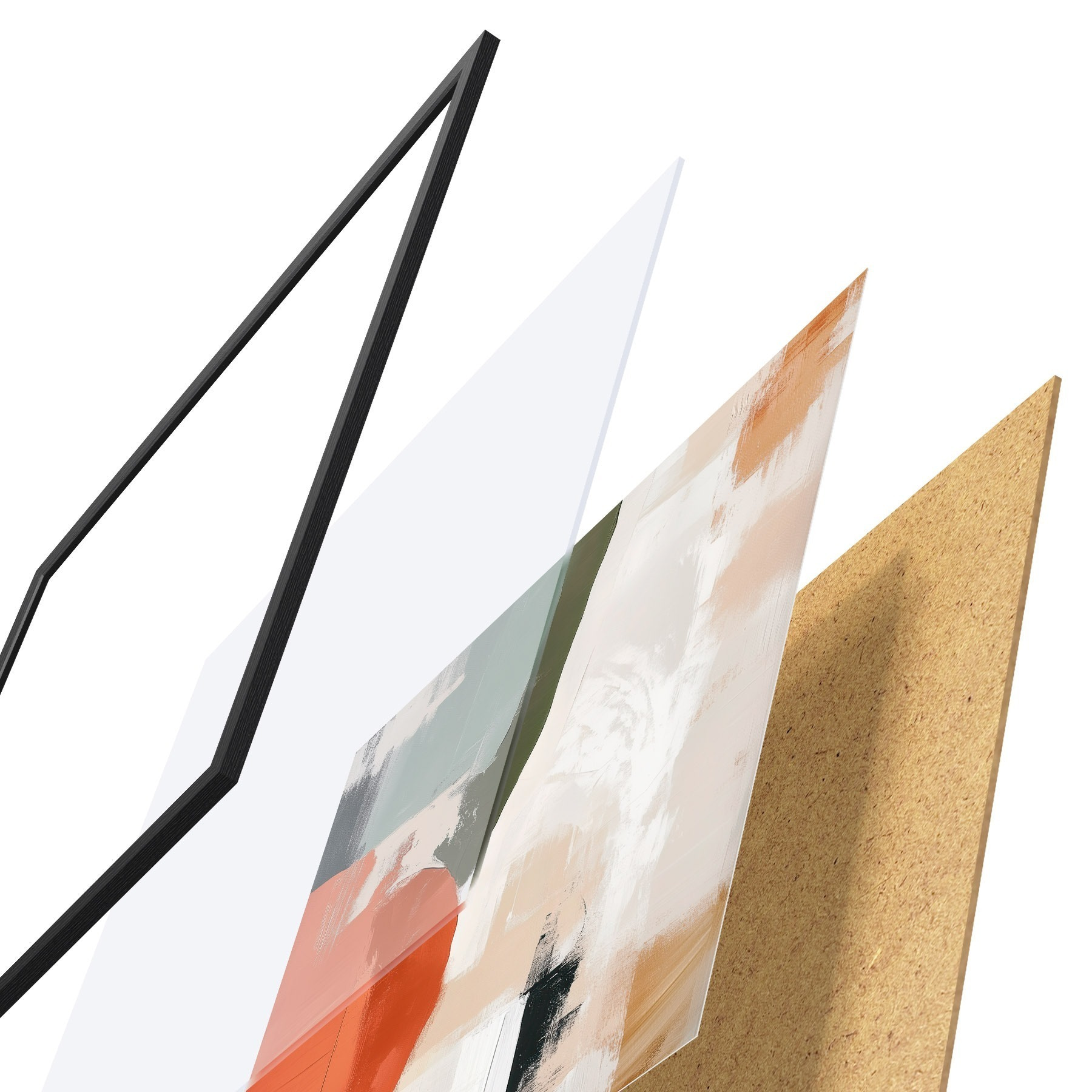 De poster bestaat uit een frame, plexiglas, geprinte afbeelding en spaanplaat achterkant. De poster kan meteen aan de muur worden gehangen dankzij de bevestigingen op de achterkant.