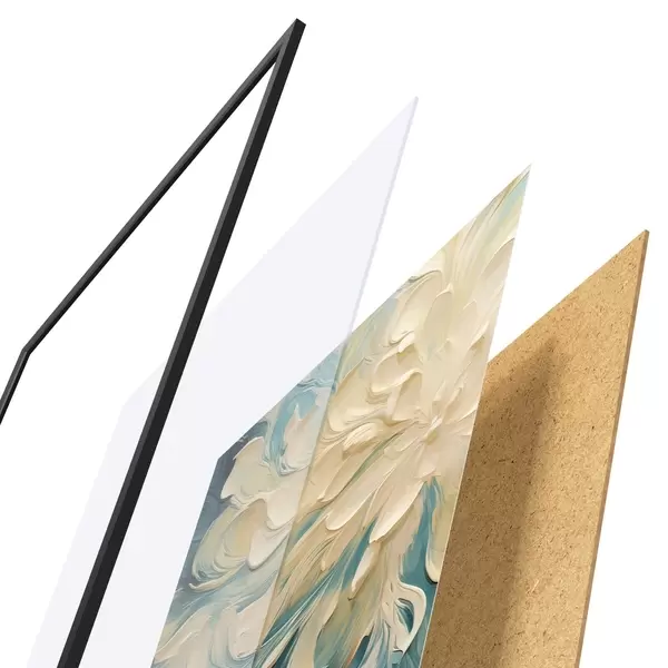 De poster bestaat uit een frame, plexiglas, geprinte afbeelding en spaanplaat achterkant. De poster kan meteen aan de muur worden gehangen dankzij de bevestigingen op de achterkant.