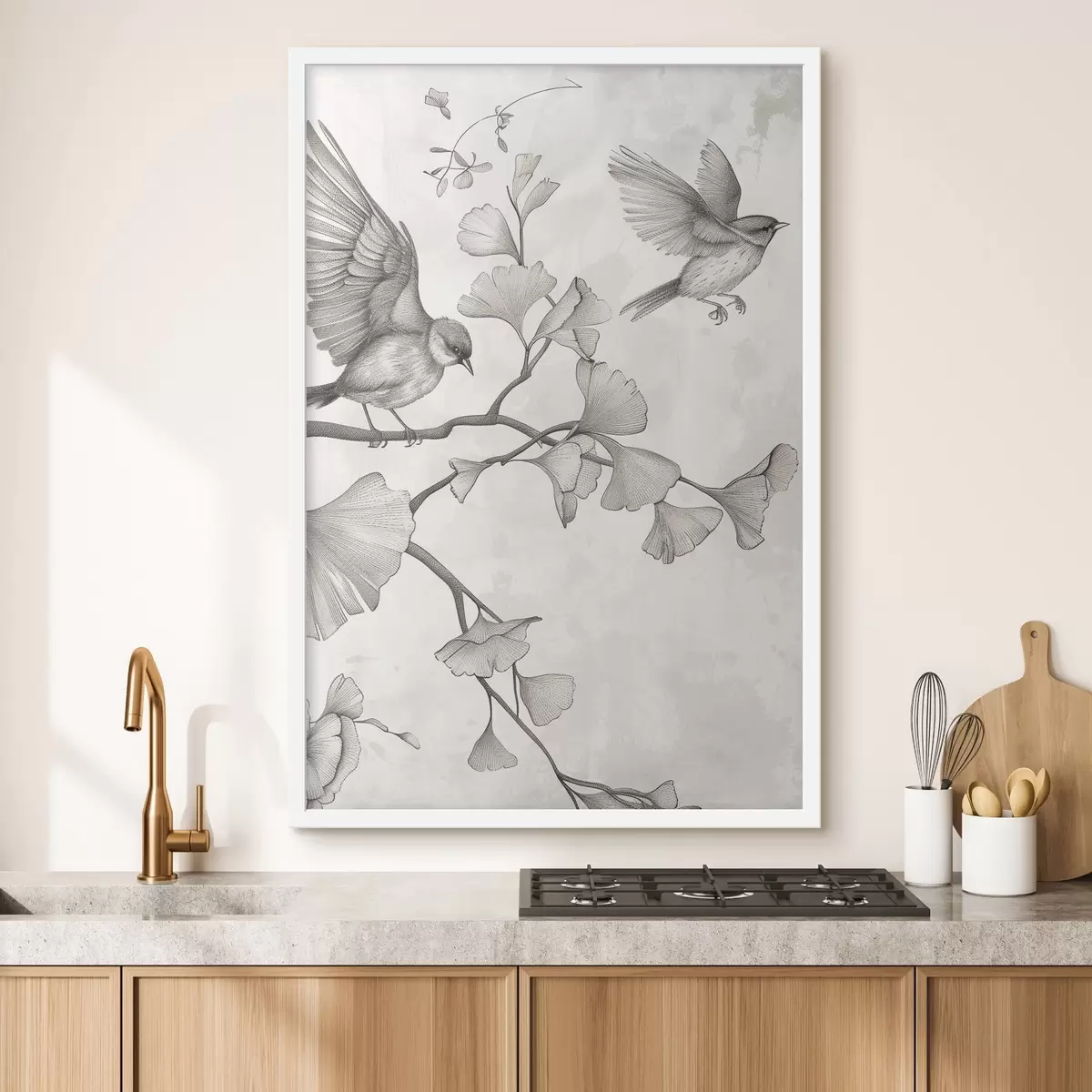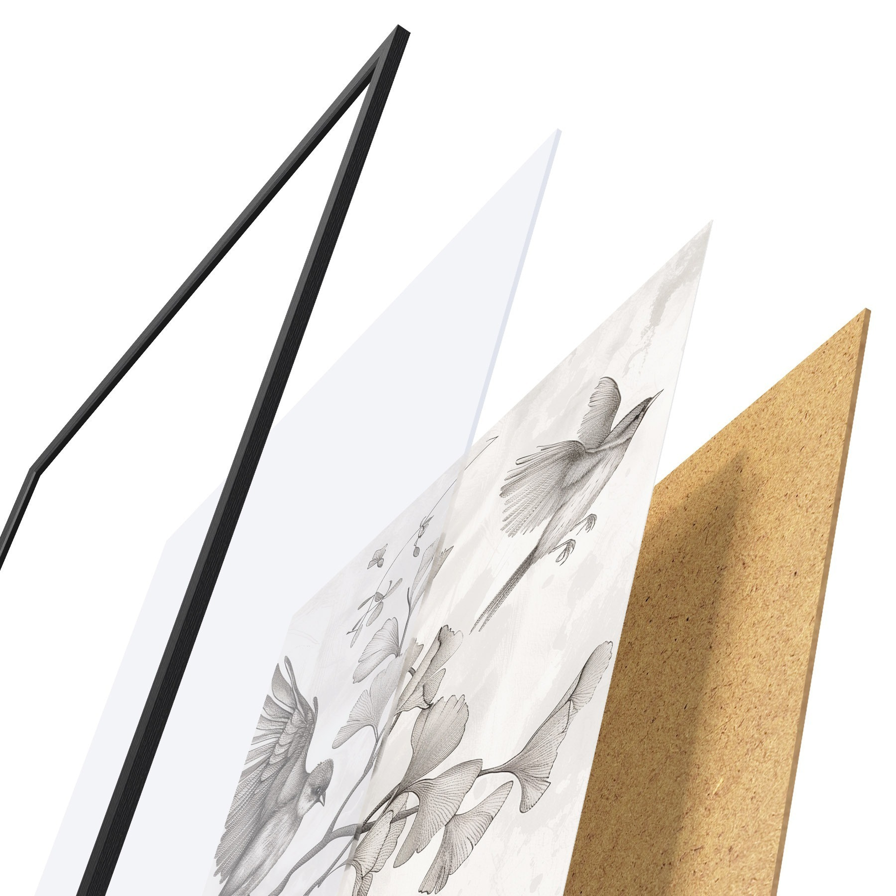 De poster bestaat uit een frame, plexiglas, geprinte afbeelding en spaanplaat achterkant. De poster kan meteen aan de muur worden gehangen dankzij de bevestigingen op de achterkant.
