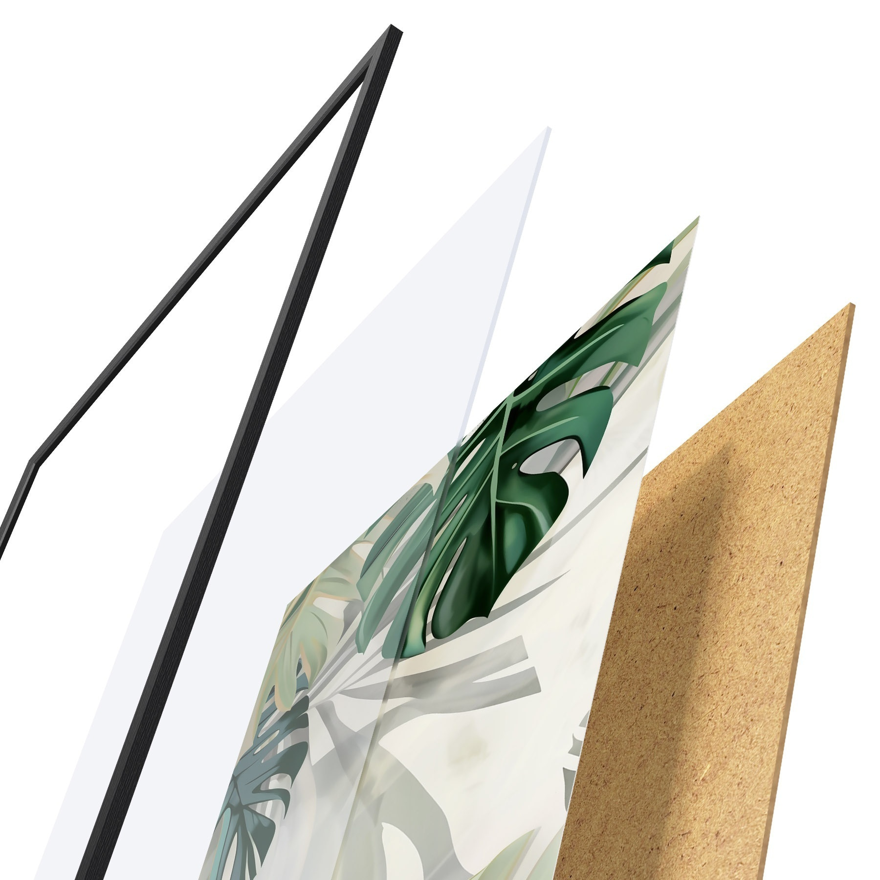De poster bestaat uit een frame, plexiglas, geprinte afbeelding en spaanplaat achterkant. De poster kan meteen aan de muur worden gehangen dankzij de bevestigingen op de achterkant.