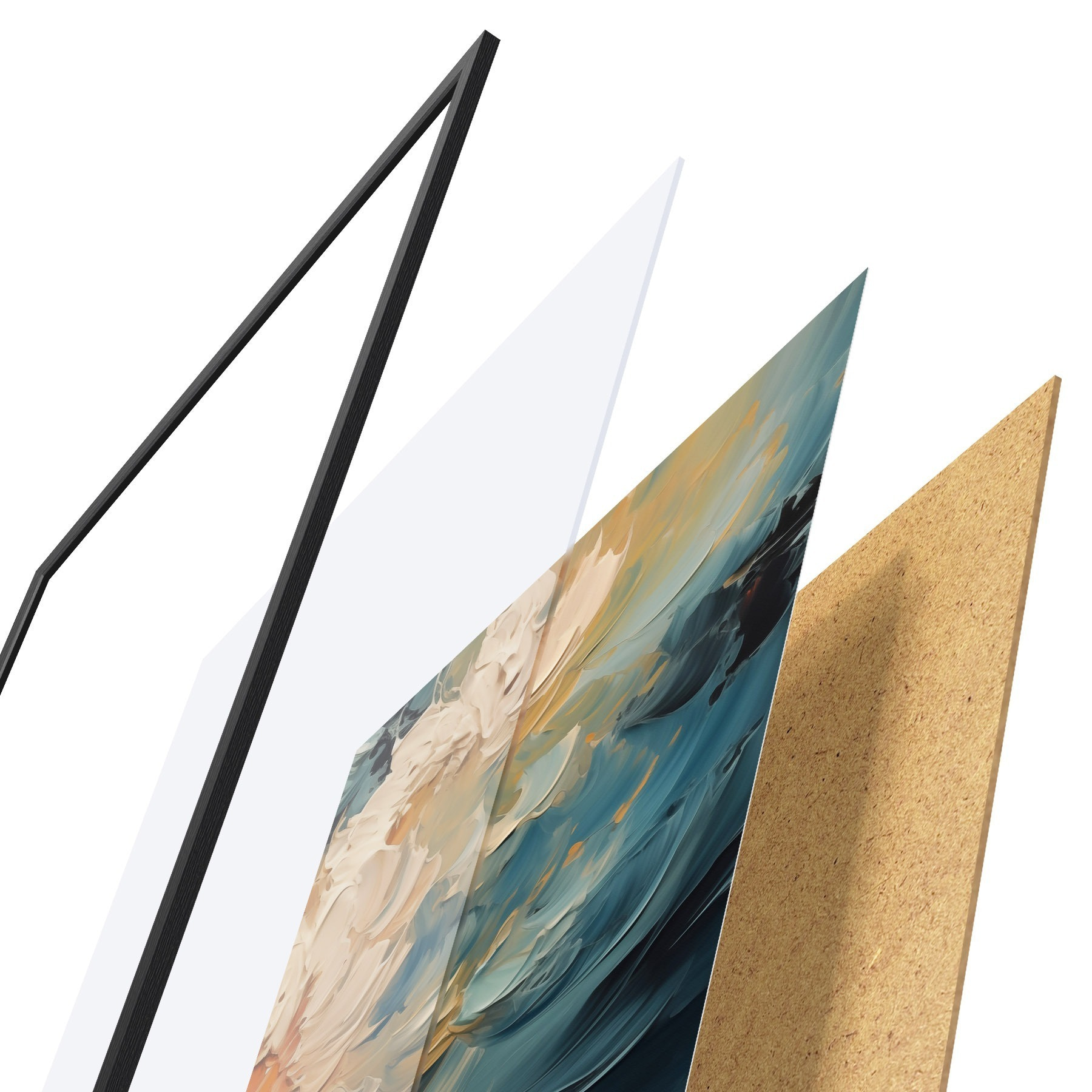 De poster bestaat uit een frame, plexiglas, geprinte afbeelding en spaanplaat achterkant. De poster kan meteen aan de muur worden gehangen dankzij de bevestigingen op de achterkant.