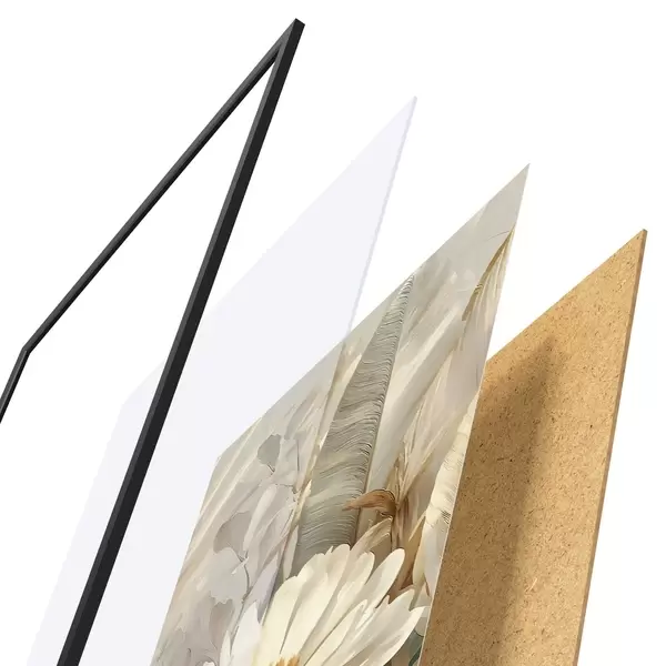 De poster bestaat uit een frame, plexiglas, geprinte afbeelding en spaanplaat achterkant. De poster kan meteen aan de muur worden gehangen dankzij de bevestigingen op de achterkant.