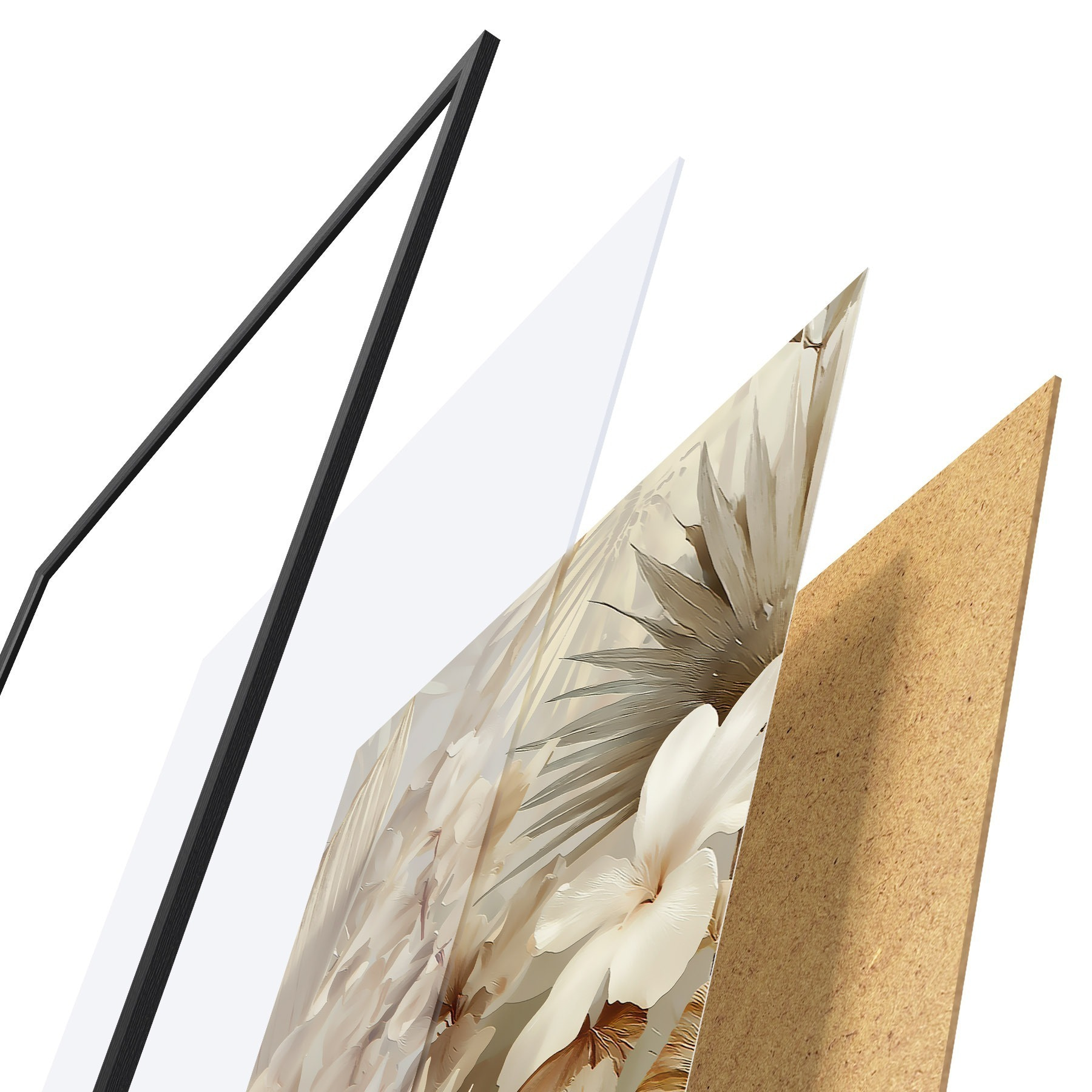 De poster bestaat uit een frame, plexiglas, geprinte afbeelding en spaanplaat achterkant. De poster kan meteen aan de muur worden gehangen dankzij de bevestigingen op de achterkant.