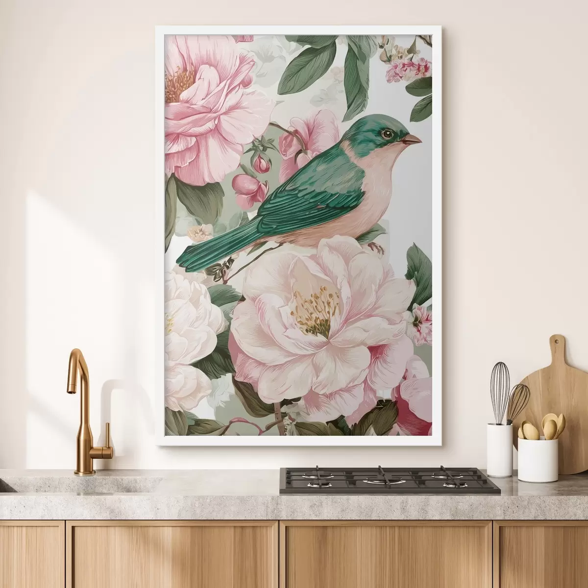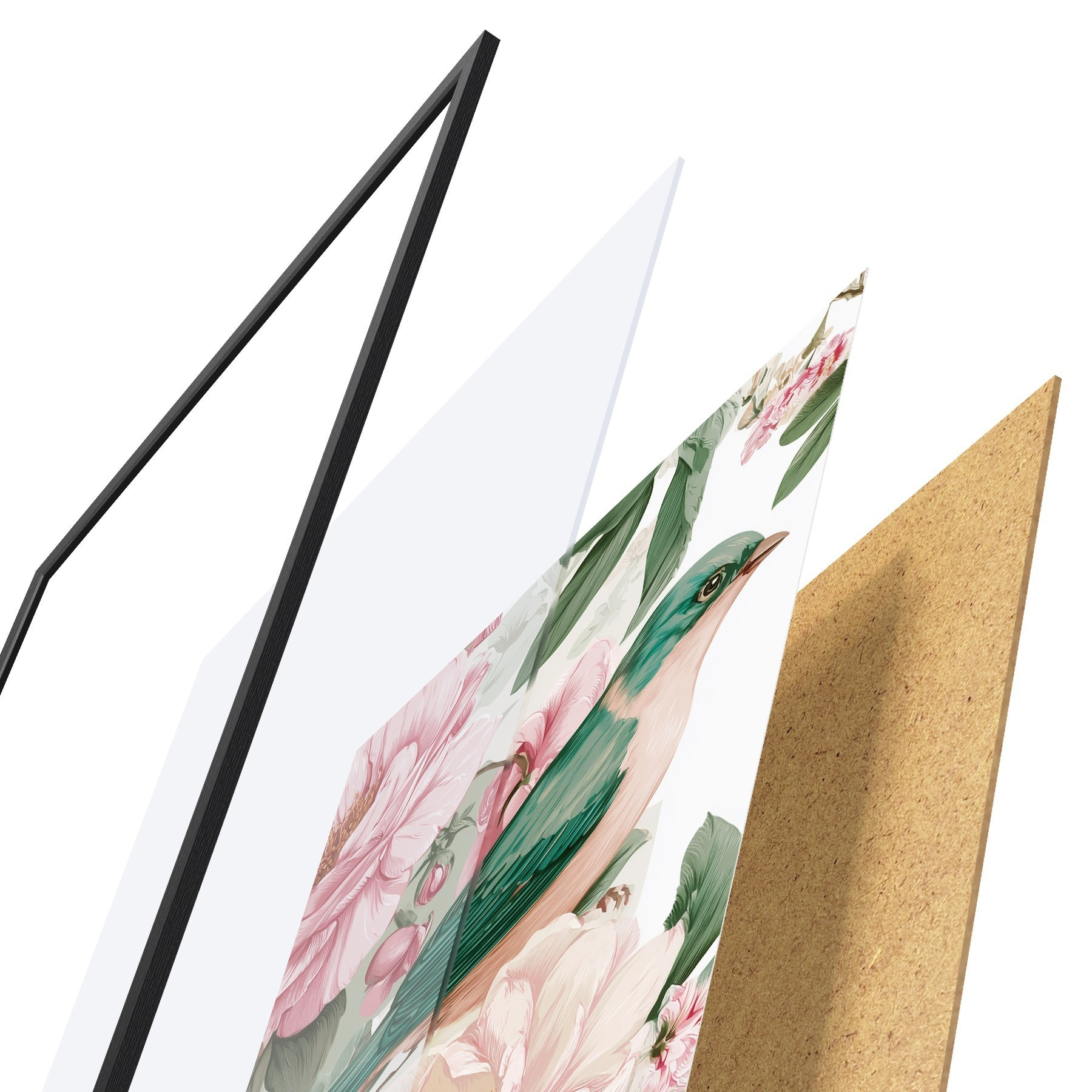 De poster bestaat uit een frame, plexiglas, geprinte afbeelding en spaanplaat achterkant. De poster kan meteen aan de muur worden gehangen dankzij de bevestigingen op de achterkant.
