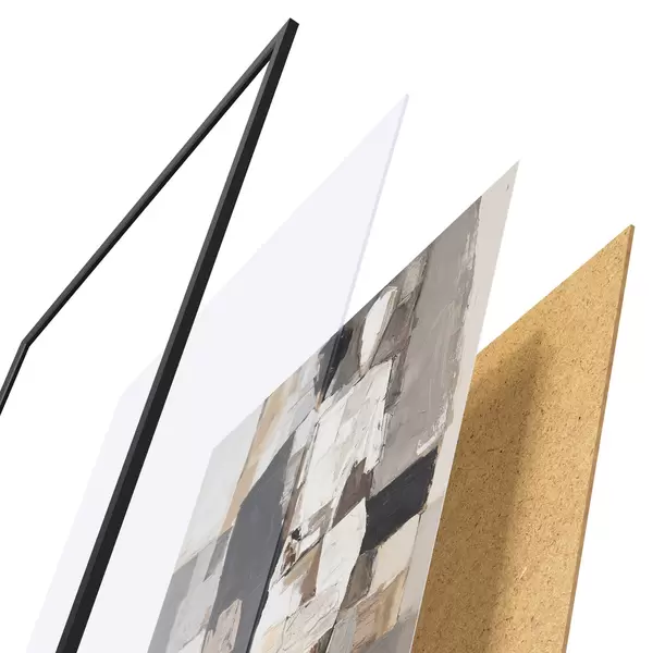 De poster bestaat uit een frame, plexiglas, geprinte afbeelding en spaanplaat achterkant. De poster kan meteen aan de muur worden gehangen dankzij de bevestigingen op de achterkant.