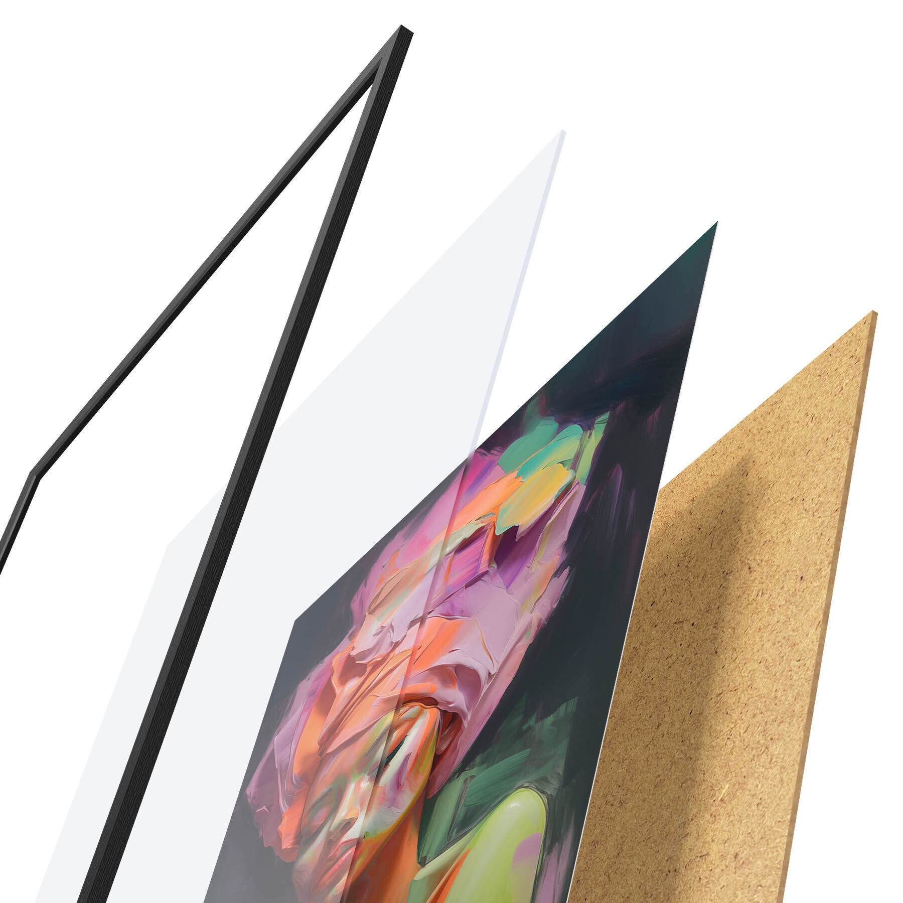 De poster bestaat uit een frame, plexiglas, geprinte afbeelding en spaanplaat achterkant. De poster kan meteen aan de muur worden gehangen dankzij de bevestigingen op de achterkant.