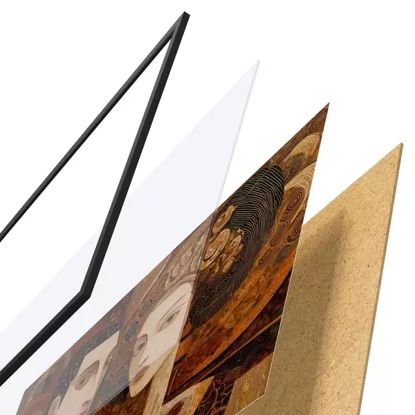 De poster bestaat uit een frame, plexiglas, geprinte afbeelding en spaanplaat achterkant. De poster kan meteen aan de muur worden gehangen dankzij de bevestigingen op de achterkant.