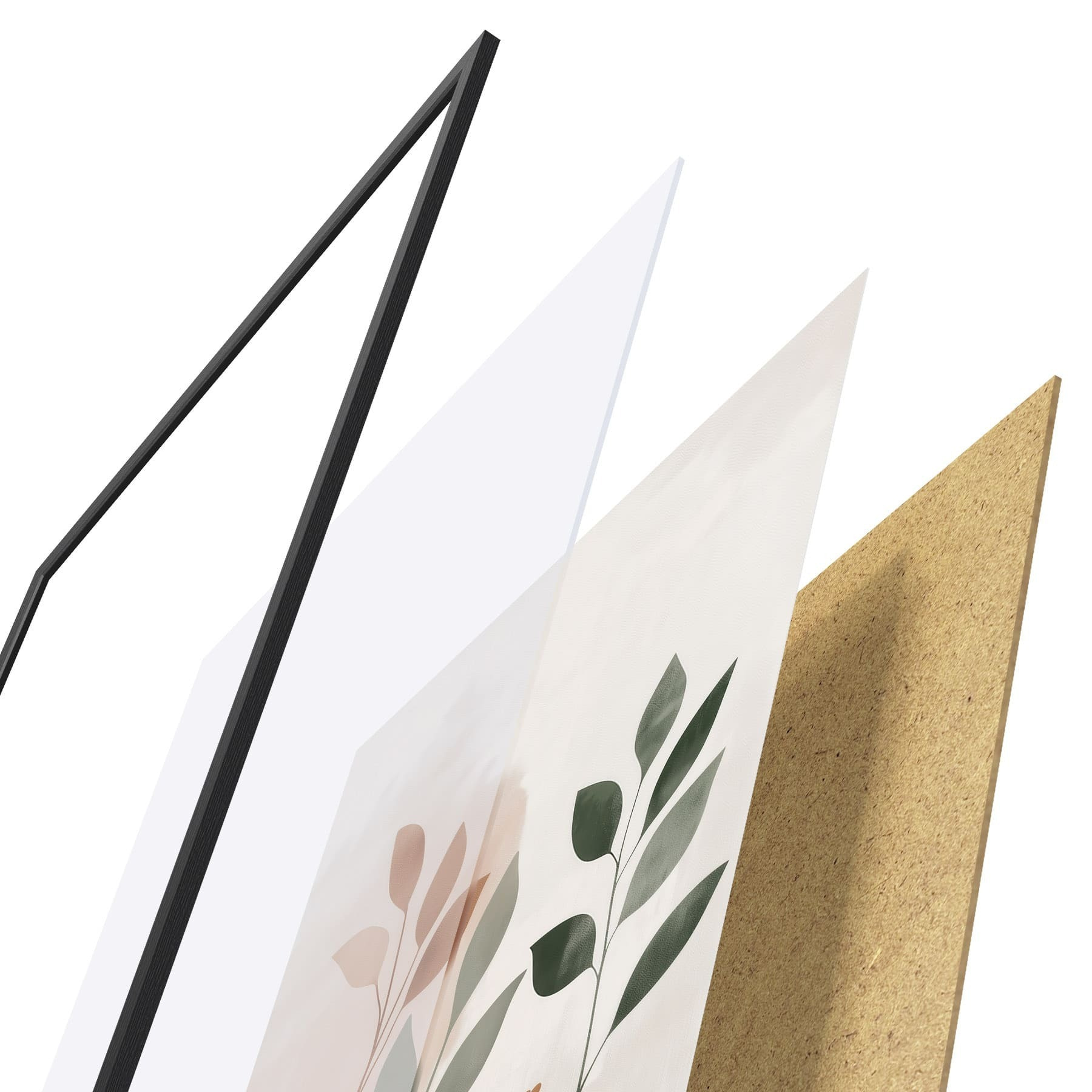 De poster bestaat uit een frame, plexiglas, geprinte afbeelding en spaanplaat achterkant. De poster kan meteen aan de muur worden gehangen dankzij de bevestigingen op de achterkant.